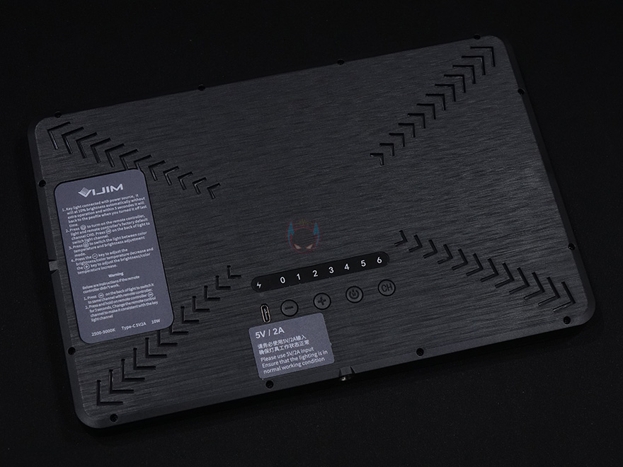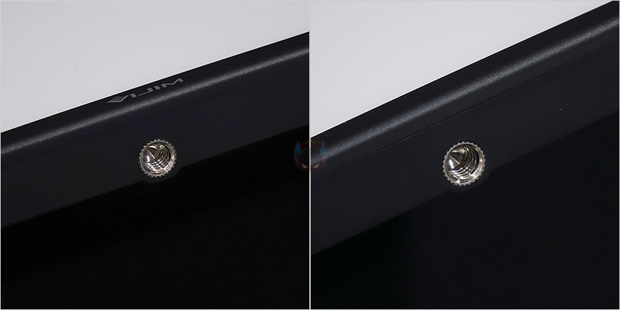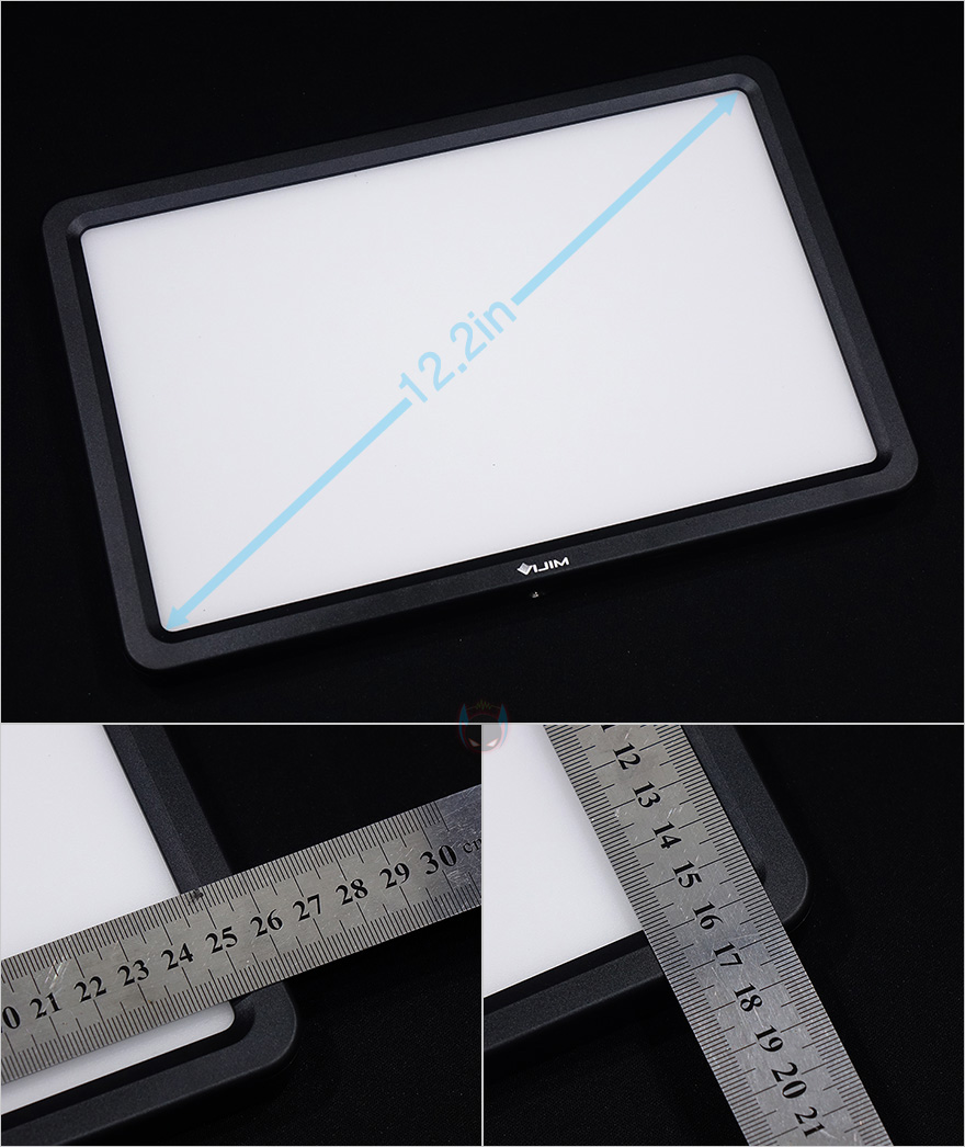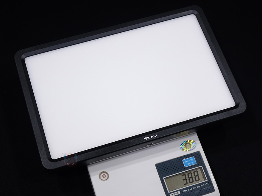그럼, 본격적으로 VIJIM VL192 LED 조명을 살펴보면, 조명 본체는 직사각형 모양으로 라이트부분의 면적은 12.2인치 크기를 가졌는데, 필자가 알아본바로는 적어도 VIJIM 제품중에서는 저전력 LED 조명제품에서는 가장 큰 사이즈입니다. 그리고, 본체 사이즈도 260x170mm로 큰 편이고, 무게는 388g으로 태블릿PC보다 조금 가벼운 편입니다. 실제로 만져봤을때는 이보다 좀 더 가볍다라는 느낌을 받습니다. 그리고, 본체 로고부분 바로 아랫쪽에는 1/4인치 볼헤드와 연결할 수 있는 나사홀이 적용되어 있으며, 오른쪽 측면에도 동일한 나사홀이 적용되어 있습니다. 그러니깐 수직/수평으로 모두 사용할 수 있는거죠.