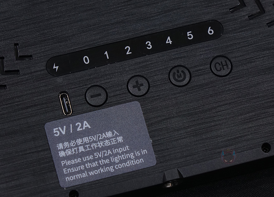 본체 후면에는 중앙 아랫부분에 전원/채널 상태를 표시해주는 인디케이터와 분리형 USB 전원케이블과 연결되는 USB Type-C 포트 및 버튼이 적용되어 있는데, 버튼은 왼쪽부터 색온도/밝기조절, 전원/모드, 채널변경 버튼이 되겠습니다. 그리고, USB Type-C 포트에는 앞서 언급한대로 5V/2A 10W의 전력공급 표시도 확인할 수 있으며, 후면에서 봤을 때 맨 왼쪽에는 후면에 배치된 버튼들의 사용 설명이 표기되어 있는데, 이부분은 제공되는 무선 리모컨을 마그네틱으로 장착할 수 있는 곳이기도 합니다.