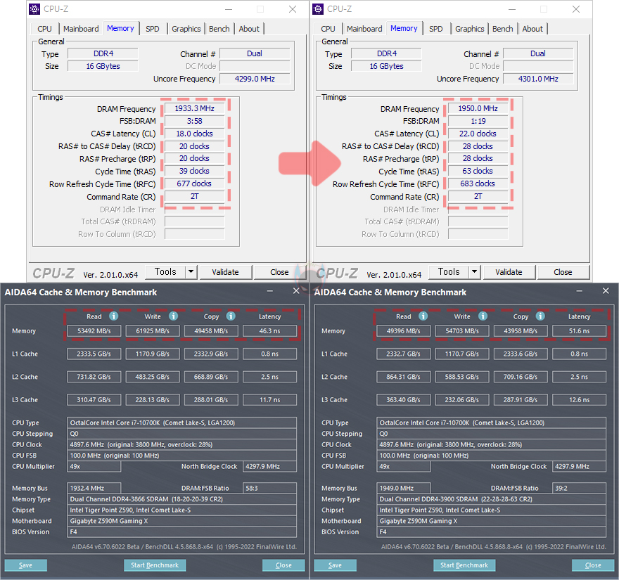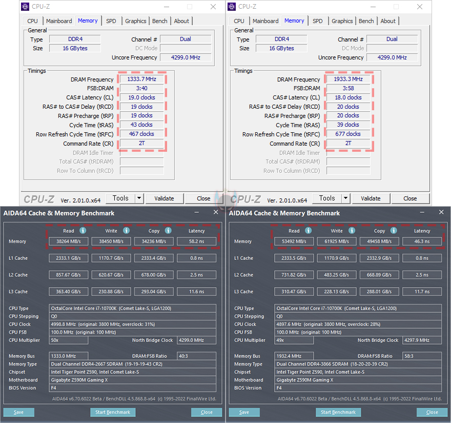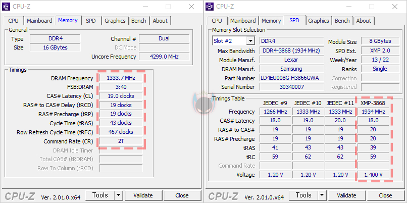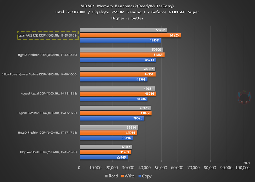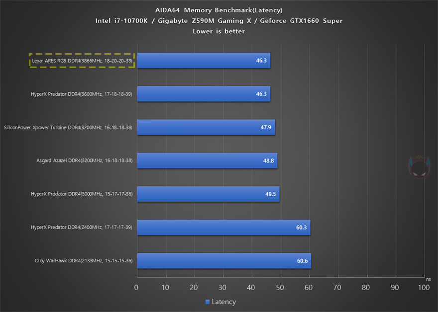 이제, 렉사(Lexar) ARES RGB DDR4의 성능을 확인해보는데, 리뷰에 사용된 제품의 클럭은 X.M.P 2.0 프로파일이 적용된 3866MHz 모델로, 프로파일을 적용하기 전에는 기본 클럭 2667MHz로 작동됩니다. 프로파일 값은 메인보드 CMOS에 X.M.P 메뉴에서 값을 불러와 적용하면 되는데, 3866MHz 클럭으로 작동할때는 1.4V의 전압으로 작동되며, 프로파일을 적용하면 성능이 향상된 것을 확인할 수 있습니다. AIDA64의 메모리 벤치마크를 통해 다른 DDR4 제품들과 비교해보면, 읽기(Read)/쓰기(Write)/복사(Copy) 대역록 용량이 가장 많은 것을 확인할 수 있으며, 레이턴시(Latency) 경우에도 램타이밍 값이 조금 아쉽긴하지만, 높아진 클럭과 함께 비교 제품들 중에서 가장 빠른 속도임을 확인할 수 있습니다.