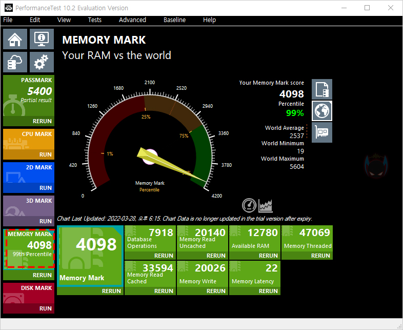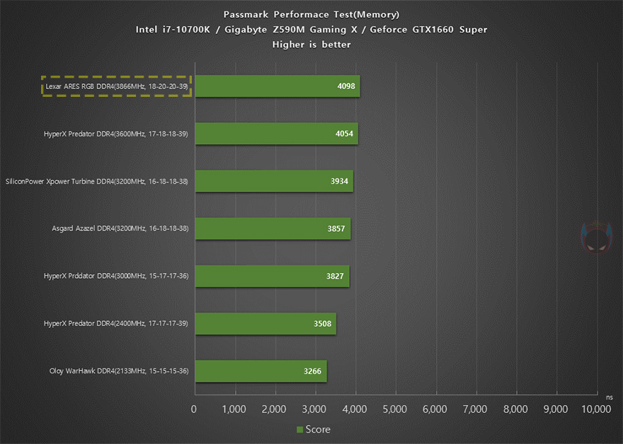 이번에는 PassMark의 Performance Test-Memory Mark를 통해, ARES RGB DDR4의 성능 점수를 확인해보면, 역시 비교 제품들 중 가장 높은 클럭을 가졌기 때문에, 가장 높은 점수의 결과값을 받는 것을 확인할 수 있습니다. 조금 아쉬운 점이라면, RAM은 수동으로도 오버클럭을 할 수 있기때문에, 추가적인 ARES RGB DDR4의 추가 오버클럭을 확인해봤는데, 클럭은 3900MHz으로 높일 수 있었지만, 램타이밍을 줄일 수 없어서, 성능은 조금 낮아졌습니다. 그래서, 사실상 X.M.P 프로파일로 적용하는 3866MHz 클럭이 최대 성능이라고 봐야하겠습니다. 물론, 수동 오버클럭을 할 줄 모르는 소비자입장에서 충분히 만족스러운 성능이라 할 수 있죠.