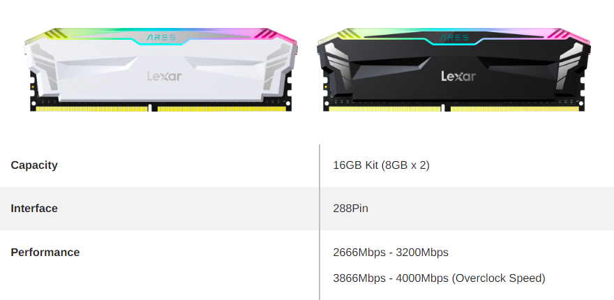 렉사(Lexar) ARES RGB DDR4 RAM을 살펴보면, 색상은 화이트(White)와 블랙(Black) 2가지 색상으로 출시되었으며, 용량은 16GB(8GBx2) 키트 한가지이고, 클럭은 2666/3200/3866/4000MHz 4가지 옵션으로 출시되었습니다. 참고로, 최근에는 Non-RGB의 ARES DDR5도 출시를 했죠. 또한, 보증기간도 평생보증(Limited lifetime warranty)입니다.