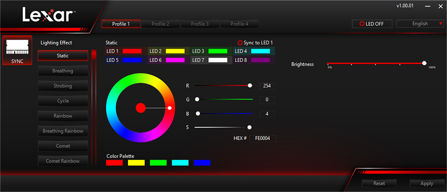 그럼, 직접 렉사(Lexar) ARES RGB DDR4 RAM을 사용해봐야겠죠. 일단, PC에 장착해서 인식이 되면 바로 RGB 조명효과를 볼 수 있습니다. 그리고, 앞서 언급했듯이, 제조사 자체적으로도 RGB S/W 'Lexar RGB Sync'를 제공해주고 있는데, 홈페이지에서 다운로드 받을 수 있죠. 프로그램을 설치해 실행해보면, LED On/Off를 비롯해 4개의 프로파일, 그리고 13가지의 LED Mode 지원을 확인할 수 있으며, RAM1/2로 각각 따로 설정할수도 있으며, 색상변경도 가능합니다.
