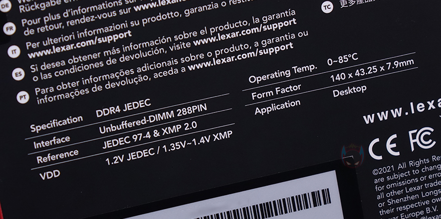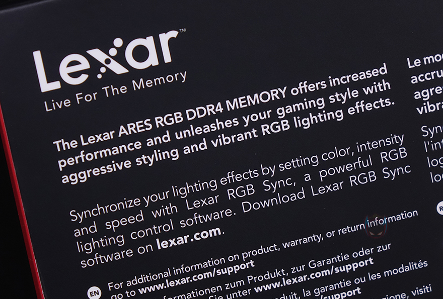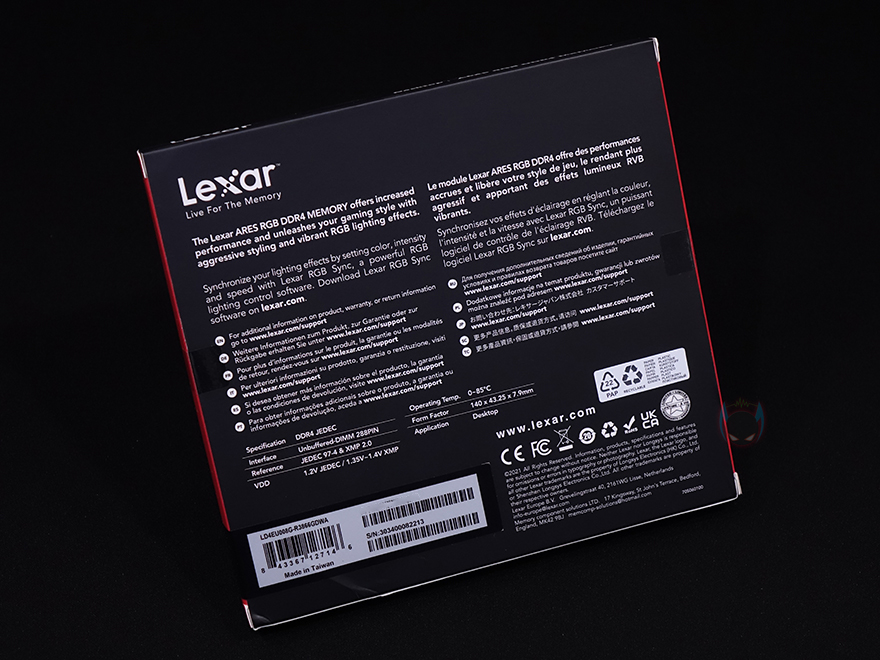 제품팩키지는 박스형태로 전면에는 제품 이미지를 담고 있어서, 구입 전에 미리 디자인을 확인할 수 있습니다. 그리고, 모델명과 함께 용량과 클럭표시도 확인할 수 있고, RGB RAM인만큼 메인보드 제조사들이 지원하는 RGB Sync 연동 지원표시도 확인할 수 있죠. 박스후면에는 방금 언급한 메인보드 제조사들의 RGB Sync외에도 제조사 자체적으로 지원해주는 Lexar RGB Sync에 대한 언급도 하고 있는데, 이부분은 뒤에서 확인해보도록 하며, 그 밖에 RAM 규격, X.M.P 2.0, 전압 등의 기본사양도 추가로 확인할 수 있습니다. 포장은 제품 크기에 맞춘 틀-방식으로 흔들리지 않게 그리고 이탈되지 않게 덮개를 함께 사용하고 있으며, RAM 제품이기때문에 RAM을 제외한 별도의 구성품은 없습니다.