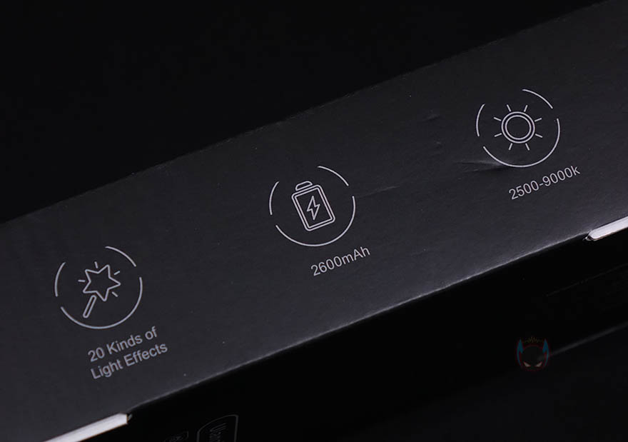 제품 박스에는 제품 풀-샷 이미지(Full-shot image)를 담고 있어서 개봉하기 전에 조명 디자인을 미리 간접적으로 확인할 수 있습니다. 그리고, 모델명과 함께 'RGB ICE LIGHT'라는 문구도 확인할 수 있어서, 이 제품이 단순 조명이 아니라 RGB 조명까지 갖추고 있다라는것도 짐작할 수 있죠. 그리고, 이는 박스 측면에 제품의 주요 특징에서 추가로 더 확신할 수 있는데, 20가지 조명모드 표기입니다. 이외에도 2,600mAh 배터리용량, 2500~9000K 색온도 표기도 확인할 수 있으며, 박스 후면에는 제품의 기본 사양표기도 해놨습니다.