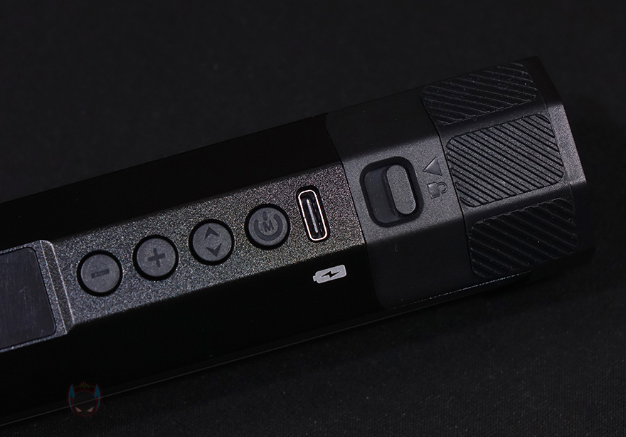 조명이 들어오는 전면은 반원 디자인을 가졌고, 후면은 각진 디자인을 가졌는데, 후면에는 360˚ RGB 컬러표시와 함께 바로 오른쪽에 OLED 디스스플레이가 적용되어 있으며, 그 옆으로는 버튼이 배치되어 있는데, -/+는 수치값을 조절할 수 있으며, ↑↓ 버튼은 항목 선택을 할 수 있습니다. 전원버튼은 모드변경과 겸용으로 갖추고 있으며, 마지막에는 충전케이블과 연결되는 USB Type-C포트가 적용되어 있죠.
