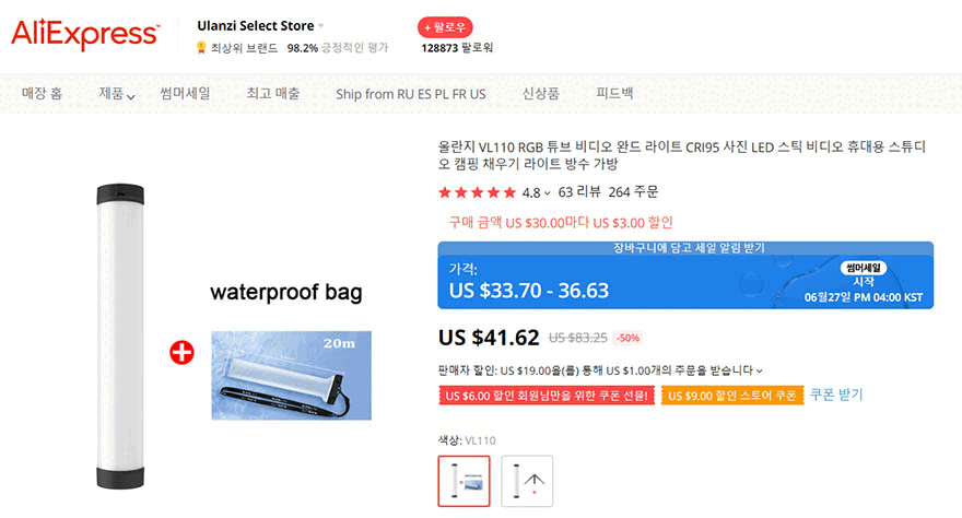제품 팩키지를 살펴보기 전에, VL110 같은경우 현재 알리익스프레스 Ulanzi 스토어에서는 구입시 2가지 옵션 중에 선택할 수 있습니다. 하나는 방수팩이 포함된 팩키지, 또하나는 삼각대가 포함된 팩키지죠. 소비자의 용도에 따라 선택하면 되겠습니다. 제품 팩키지는 박스형태로 박스 전체까지 비닐밀봉처리가 되어 있습니다. 이런 팩키지 처리는 해외 직구 이용자들에게 판매 제품에 대한 신뢰를 가질 수 있는 부분이기도 하죠.