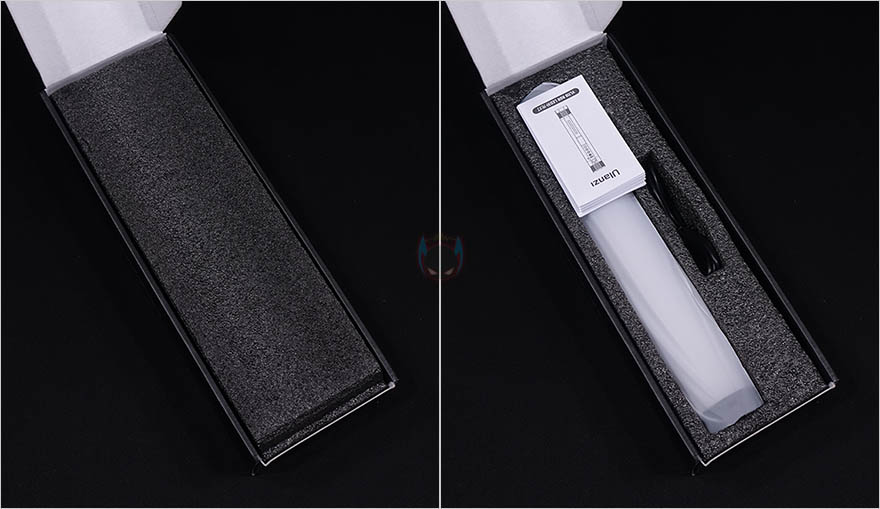 제품 박스를 열어보면, 조명 제품이기때문에 외부 충격에 의한 파손방지를 위해 우레탄-폼 포장재를 사용하고 있으며, 제품도 흔들리지 않게 폼에 끼워진 형태로 있습니다. 제품 구성은 VL110 조명, 충전케이블, 제품설명서로 이루어져 있죠.