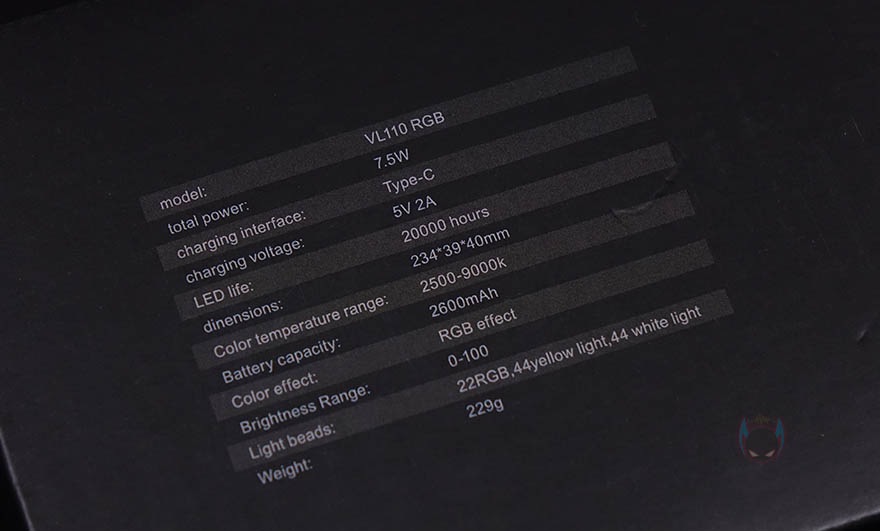 제품 박스에는 제품 풀-샷 이미지(Full-shot image)를 담고 있어서 개봉하기 전에 조명 디자인을 미리 간접적으로 확인할 수 있습니다. 그리고, 모델명과 함께 'RGB ICE LIGHT'라는 문구도 확인할 수 있어서, 이 제품이 단순 조명이 아니라 RGB 조명까지 갖추고 있다라는것도 짐작할 수 있죠. 그리고, 이는 박스 측면에 제품의 주요 특징에서 추가로 더 확신할 수 있는데, 20가지 조명모드 표기입니다. 이외에도 2,600mAh 배터리용량, 2500~9000K 색온도 표기도 확인할 수 있으며, 박스 후면에는 제품의 기본 사양표기도 해놨습니다.