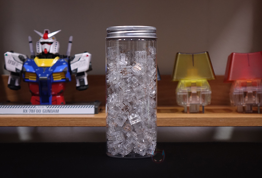 기계식 키보드의 스위치는 일종의 부품이자 액세서리 제품군이기때문에 보통 단순 비닐포장에 담기는 경우가 많은데, 카일(Kailh)은 그래도 보틀 같은곳에 포장을 해줍니다. 바로, Clione Limacina(클리오네 리마키나) 스위치를 살펴보면, 가장 먼저 눈에 들어오는 부분은 올-클리어(All-Clear) 하우징입니다. 상하부 모두 클리어 상태이고, 심지어 슬라이더부분까지 클리어죠. 그래서, 일반적인 스위치들과 달리 내부 구조도 간접적으로 노출이 됩니다. 핀(pin)은 접전과 기둥 포함해서 5pin 입니다.