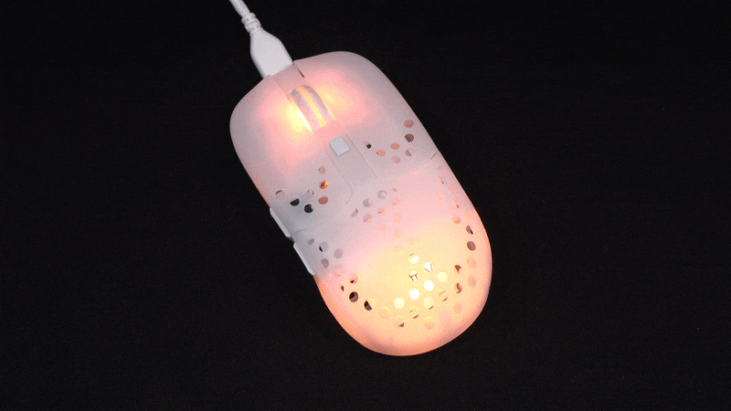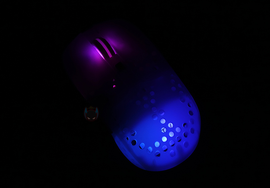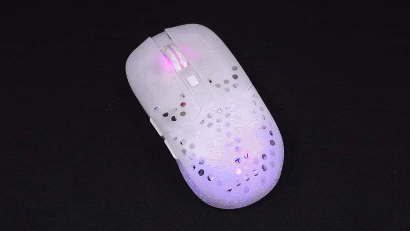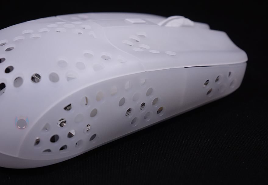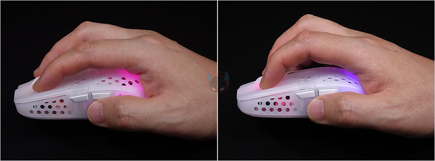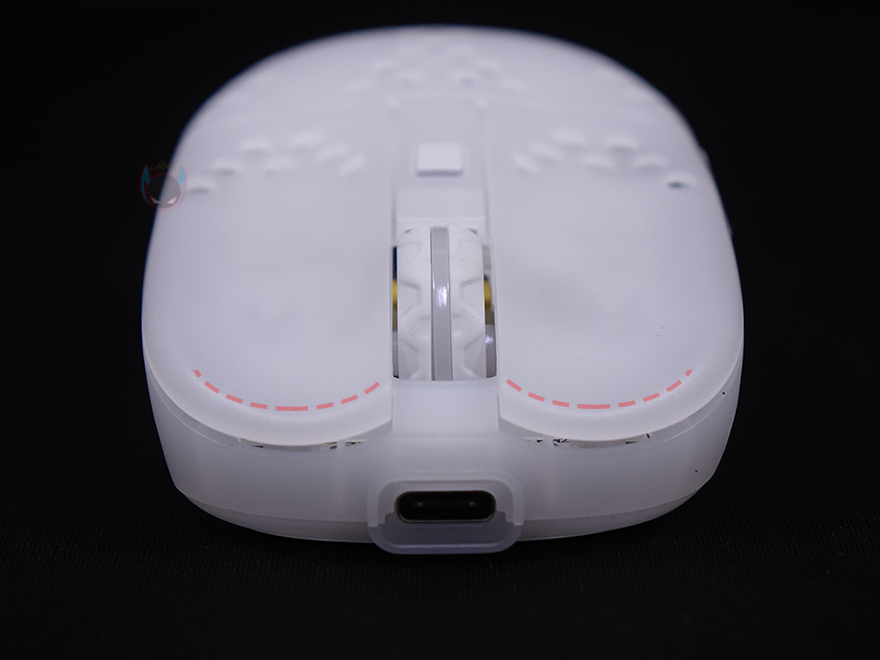 부위별로 좀 더 자세히 살펴보면, 기본 좌우버튼은 클릭 정확성을 위해 분리영역으로 되어 있으며, 손가락의 인체공학적 디자인을 그대로 적용해 전면에서 보면 굴곡형태인 것을 확인할 수 있습니다. 또한, 전면에는 충전케이블과 연결되는 USB Type-C 포트 배치도 확인할 수 있죠. 훨-버튼 바로 뒤에는 DPI와 RGB 모드변경 등으로 사용되는 기능버튼이 적용되어 있으며, 뒤에서 확인하겠지만, 휠-버튼 주변으로 RGB 조명효과를 볼 수 있습니다. 그리고, 양쪽 측면에도 초경량 무게를 위해 타공망 디자인으로 처리되어 있죠.