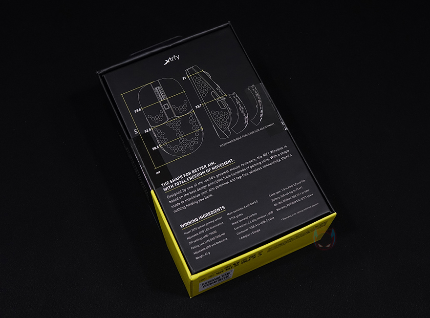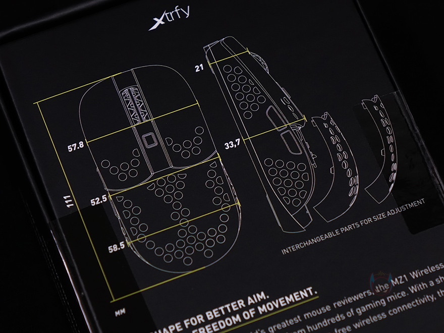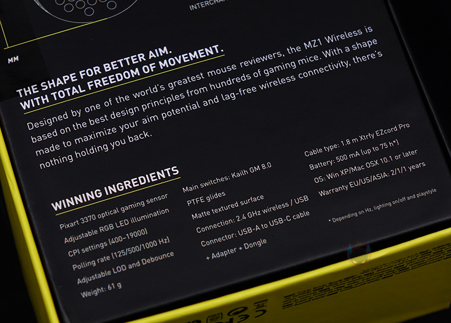 박스 후면에는 제품의 사이즈를 부위별로 상세하게 표기해놨는데, 눈치가 빠른 소비자라면 이부분에서 방금 언급했던 이번 제품의 주요 특징인 팜-레스트 조절이 어떤 방식인지를 알 수 있습니다. 그리고, 아래에는 제품 소개와 기본 사야을 표기해놨는데, 기존 유선 제품을 알고 있었던 소비자라면, 쉽게 센서부분이 바뀌었다라는걸 눈치챌 수 있죠. 물론, 이번 MZ1 wireless는 무선 모델이기때문에, 당연히 현재 무선으로써 최고 센서라 할 수 있는 Pixart 3370를 탑재하는건 당연한겁니다.