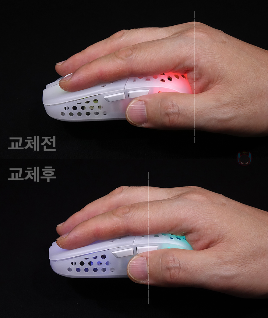 끝으로, 그립에 대해서 이야기를 하자면, 필자의 경우 손크기가 딱 F10 사이즈인데, MZ1 wireless 게이밍 마우스 같은경우 앞서 확인했듯이 팜-레스트 교체가 되기때문에, 기본 장착된 팜-레스트와 교체한 팜-레스트를 비교해보면, 그립의 위치가 차이나는 것을 확인할 수 있습니다. 기본 장착된 팜-레스트를 사용하면 손가락과 손바닥 연결부위까지만 밀착되는 그립으로 일종의 팜-그립과 핑거-그립이 섞인 그립이라 할 수 있으며, 교체용 팜-레스트를 사용하면, 좀 더 앞쪽으로 손이 이동된 그립으로 전형적인 팜-그립에 가깝습니다. 물론, 손 크기에 따라서 그립 형태가 달라지지만, 팜-레스트만으로도 최소한 손의 위치가 달라지기때문에 자신에게 최적의 그립으로 사용할 수 있겠습니다.