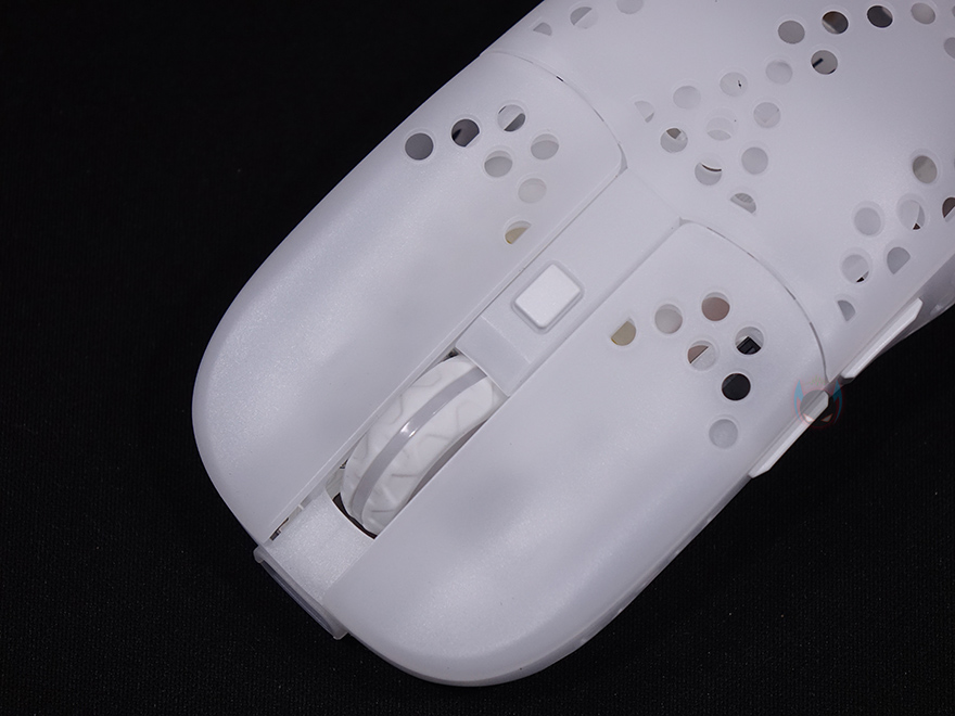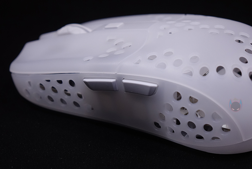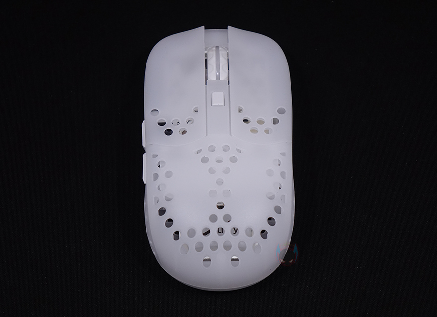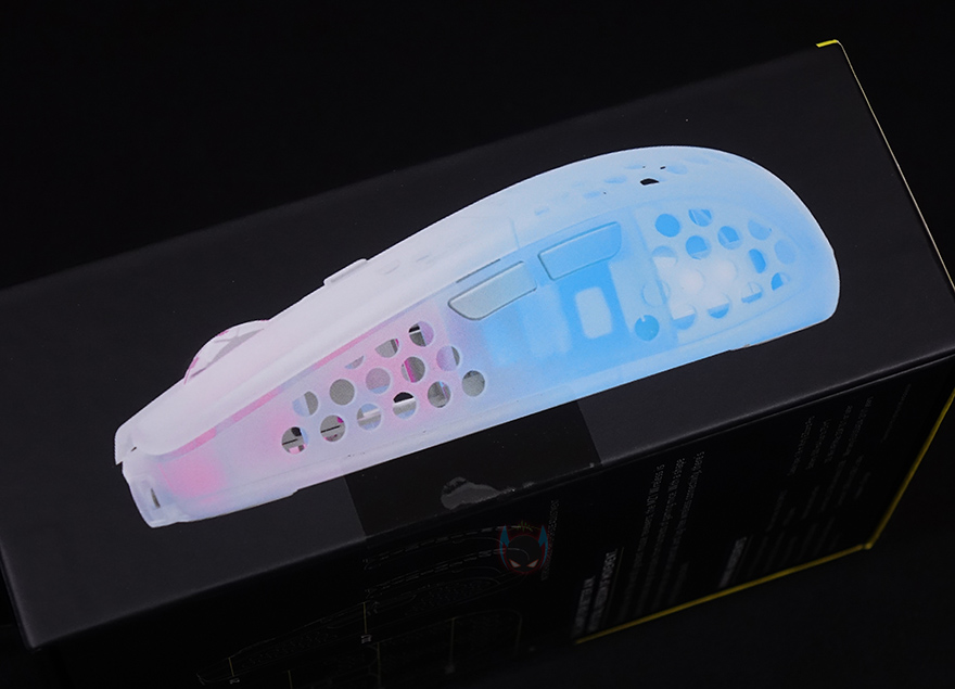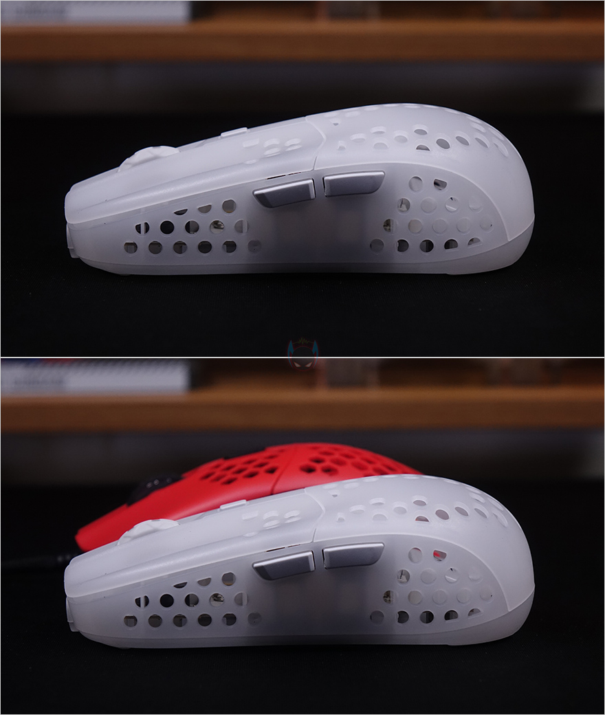 Xtrfy(엑스트리파이) MZ1 wireless 게이밍 마우스를 본격적으로 살펴보면, 앞서 언급했듯이 디자인에선 기존 유선모델과 동일하며, 색상은 화이트와 블랙 2가지로 역시 유선 모델과 동일합니다. 쉽게 말해, 유선때와 마찬가지로 Rocket Jump Ninja의 디자인입니다. 또한, RGB 조명효과를 위해 반투명으로 처리되어 있죠. 좌우 대칭형이지만, 왼쪽 측면에 추가버튼이 있기때문에 오른손잡이 마우스이며, 기본 장착된 팜-레스트상태에서 마우스 측면을 보면 일반적인 마우스 형태가 조금 다르다라는걸 알 수 있는데, 마우스 중간이 가장 높은 위치가 아닌 팜-레스트 뒷부분이 가장 높습니다. 쉽게 말해, 손의 손등부분이 가장 높듯이 그대로 손의 인체공학적 그립을 적용한거죠.