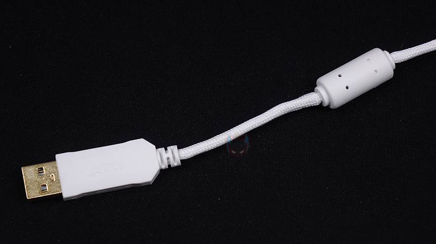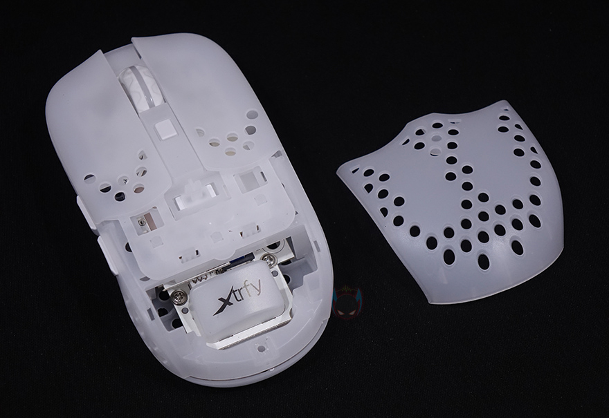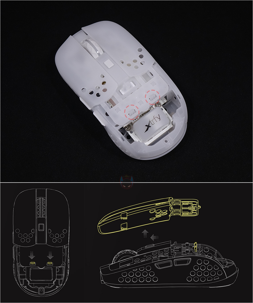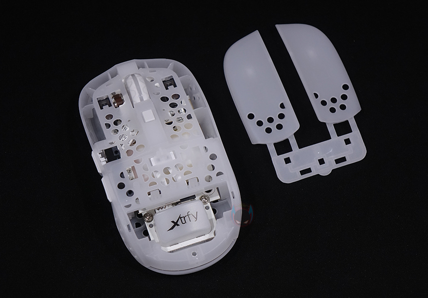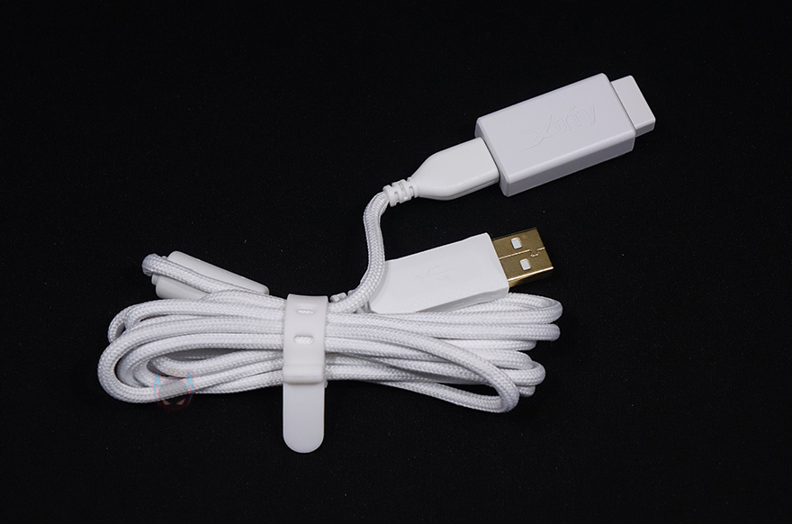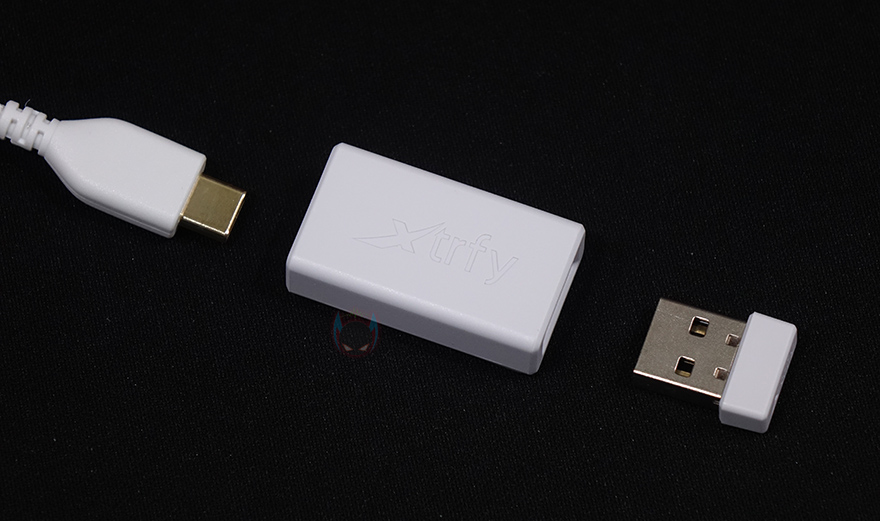 그리고, 앞서 확인한 팜-레스트 분리상태에서 로고 윗부분에 2개의 걸쇠장치가 있는데, 살짝 밀어주면 앞부분 상판 커버도 분리가 됩니다. 물론, 완전히 내부까지 보려면 밑바닥에 부착된 테프론피트를 제거하고 나사까지 풀어야합니다. 분리된 상판 커버 안쪽을 보면 기본 좌우버튼의 댐버가 내구성을 위해 ㅁ자 형태인걸 확인할 수 있죠. 참고로 기본 좌우버튼 스위치는 앞서 사양표기에서 확인했듯이 유선 모델과 동일한 카일(Kailh) 스위치를 사용했습니다. 끝으로, 충전 및 유선케이블은 꼬임방지를 위해 슬리빙처리를 했으며, 유연성과 내구성을 위해 Xtrfy(엑스트리파이)는 이를 Ezcord Pro라고 명칭하고 있습니다. 또한, USB Type-C 인터페이스쪽에는 무선 사용시 동글이 길이 확장용 젠더와 무선 2.4GHz 동글이가 개봉시 연결되어 있는 상태입니다. 사용환경에 따라서 무선 2.4GHz 동글이를 바로 PC에 꽂아서 사용할지, 케이블에 젠더를 연결해서 길이를 확장한 상태에서 사용할지 선택하면 됩니다. 또한, 반대쪽 USB Type-A 인터페이스에는 신호손실 최소화를 위해 노이즈필터가 적용되어 있죠.