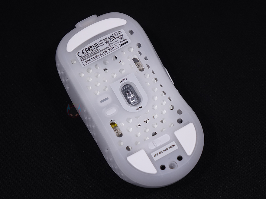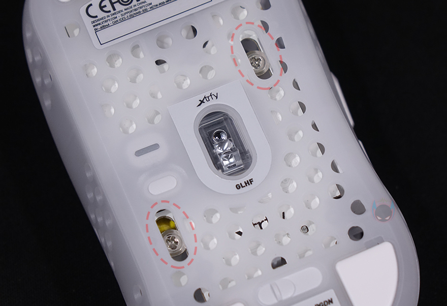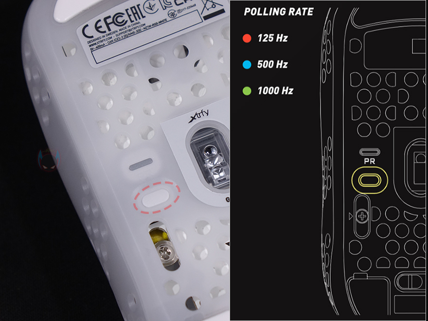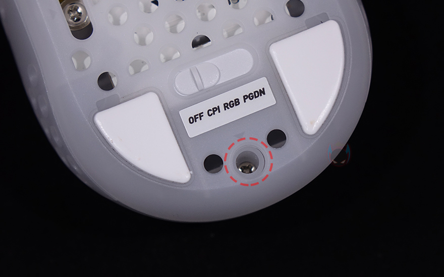 마우스 밑바닥 부분에는 위아래부분에 부드러운 움직임을 위해 테프론피트가 기본 부착되어 있으며, 가운데는 센서부분으로 앞서 언급했듯이 무선모델이기때문에 현재 무선 최상위 광센서라 할 수 있는 Pixart 3370이 탑재되어 있습니다. 그리고, 앞서 확인한 팜-레스트 교체외에도 이번 무선 모델과 기존 유선의 또하나의 큰 차이가 있는데, 바로 무게 중심 조절입니다. 이번 MZ1 wireless 모델에선 광센서 기준으로 양쪽 상하 위치에 각각 나사가 하나씩 적용되어 있는데, 바로 이 나사를 통해 무게 중심을 앞뒤로 조절할 수 있습니다. 실제로 나사를 풀어보면 무게 중심이 이동한 것을 체감할 수 있죠. 그리고, 역시 광센서를 기준으로 왼쪽에는 추가버튼이 하나 있는데, 바로 전송제어속도 버튼으로 유선과 마찬가지로 125/500/1000Hz 3단계로 변경할 수 있습니다.