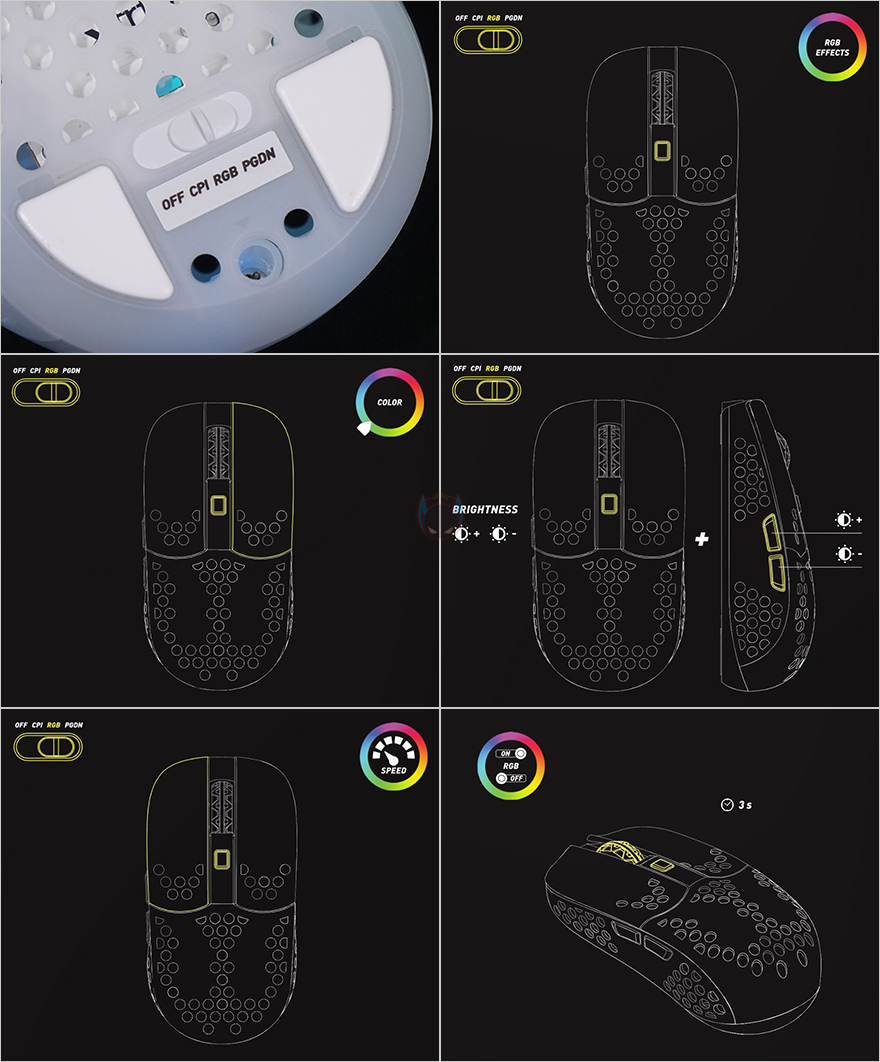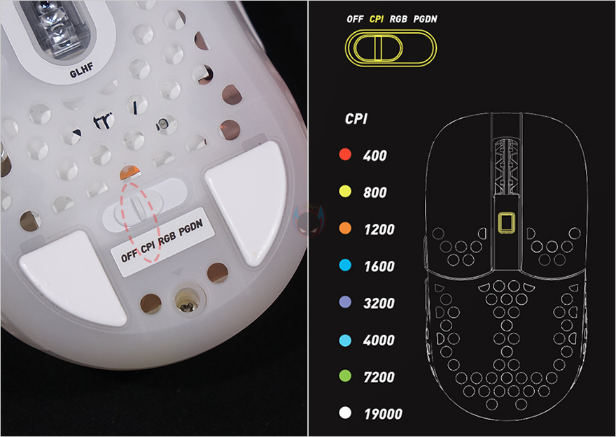 이 외에도 스위치 변경과 상관없이 측면버튼 2개와 좌우버튼을 3초이상 누르면 리프트-오프거리를 1mm와 2mm 중 선택할 수 있으며, 휠-버튼과 측면버튼 2개를 5초이상 누르면 디바운스 시간을 조절할 수 있으며, 오른쪽버튼과 측면버튼 2개를 5초이상 누르고 있으면 공장초기화로 돌릴 수 있습니다. 그리고, 스위치를 CPI(DPI)로 위치시키면 훨-버튼 뒤에 기능버튼이 CPI(DPI)변경버튼으로 작동해 400~19,000CPI까지 총 8단계로 전환할 수 있습니다.