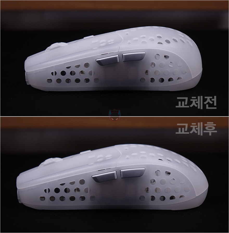 물론, 팜-레스트는 앞서 언급했고 부속품에서 확인했듯이 교체가 가능합니다. 마우스 밑바닥 맨 아랫에 나사를 풀면, 쉽게 분해가 되고 두 팜-레스트를 위에서 내려다보면 동일한 디자인이라 차이가 없다 생각할 수 있지만, 측면에서 보면 높이가 다르죠. 그래서, 기본 장착된 팜-레스트에서 교체용 팜-레스트로 바꾸면 마우스 높이가 일반적인 마우스처럼 중간부분이 높아지는 것을 확인할 수 있습니다. 참고로, 팜-레스트 교체와 상관없이 마우스의 무게는 61~2g으로 동일합니다.