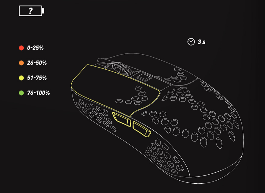 직접, Xtrfy(엑스트리파이) MZ1 wireless 게이밍 마우스를 사용해보면, 유선 사용은 충전케이블을 마우스와 PC에 연결하면 바로 사용할 수 있고, 무선 같은경우에는 무선 2.4GHz 동글이를 PC나 외부기기에 꽂은 상태에서 마우스 밑바닥 맨 아랫부분에 위치한 스위치를 Off→PGDN으로 밀어줍니다. 그럼, 전원이 켜지면서 바로 사용이 가능하고, 마우스가 인식되면 바로 RGB 조명효과를 볼 수 있죠. 화이트색상 같은경우 밝은 곳보다는 어두운 곳에서 더 선명하게 조명효과를 볼 수 있습니다. 그리고, 무선 사용시 배터리 잔량 확인은 왼쪽버튼과 측면버튼 2개를 3초간 누르고 있으면, 색상으로 보여주고, 유선시에는 RGB 조명모드 대신에 배터리 충전상태를 깜빡이면서 그대로 보여줍니다.