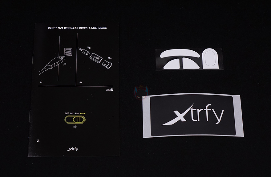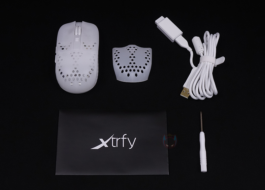 박스를 열어보면, 포장은 Xtrfy(엑스트리파이)의 다른 마우스 제품들과 유사한 방식으로 윗 공간에 마우스가 있으며, 아랫공간에는 부속품들이 비닐포장으로 들어있습니다. 제품 구성은 MZ1 wireless 게이밍 마우스, 교체용 팜-레스트, 충전케이블 및 무선 2.4GHz 동글이, 봉투, +자 드라이버 공구 제공으로 이루어져 있으며, 봉투에는 설명서와 로고 스티커, 추가 여분의 테프론피트가 들어있습니다.