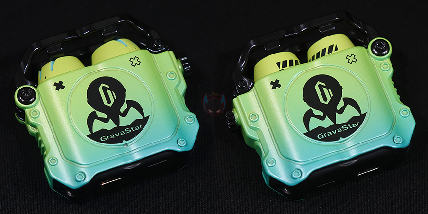그럼, 그라바스타(Gravastar) 시리우스(SIRIUS) 무선 이어폰을 본격적으로 살펴보는데, 색상은 네온 그린(Neon Green), 스페이스 그레이(Space Gray) 2가지로 출시되었으며, 시리우스 프로(SIRIUS Pro) 모델에서도 잠깐 언급했듯이 둘의 가장 큰 차이점은 프로 모델 충전케이스에 오프너(Opener) 디자인이 추가되었다라는 점입니다. 그래서, 시리우스(SIRIUS)의 충전케이스는 기본에 충실했다할 수 있지만, 그대로 게이밍컨셉을 가졌기때문에 일반적인 무선 이어폰들의 충전케이스와는 차별성을 기본 모델에서부터 가지고 있었습니다. 무게는 프로 모델보다 약간 사이즈가 작기때문에 약 97g정도인데, 프로 모델에서 언급했듯이 시리우스(SIRIUS) 기본 모델에서부터 아연 합금(Zinc Alloy) 소재를 사용했기때문에 무게 역시 일반 무선이어폰들보다는 묵직한 느낌이죠.