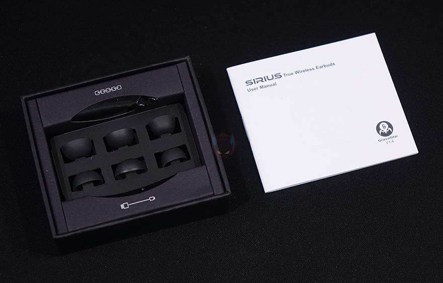 팩키지를 열어보면, 왼쪽에는 바로 포장된 시리우스(SIRIUS) 무선 이어폰을 볼 수 있으며, 오른쪽에는 부속품이 담긴 별도의 박스가 포장되어 있는데, 박스를 열어보면 제품설명서, 체인-줄, 3가지 크기별 이어-팁, 충전케이블이 들어있습니다. 참고로 구성품은 프로 모델에서도 그대로 동일하게 적용되었습니다.
