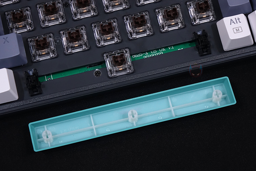 키-캡은 PBT재질에 이중사출 방식이며, 스위치는 앞서 언급했듯이 총 3가지 타입이며, 스위치 회사는 후아노(Huano)입니다. 그리고, 제공되는 스위치 리무버를 사용해 스위치를 분리할 수 있는 핫-스왑(Hot-swap)방식을 적용하고 있는데, 스위치를 기판에서 빼내보면, 기판이 3pin 방식으로 장착되는 것을 확인할 수 있어서, 5pin 스위치는 호환이 되지 않으며, 후아노 스위치 같은경우에도 체리 같은 스위치와 비교해보면, 핀(pin) 폭이 좀 더 좁은 것을 확인할 수 있습니다. 그래서, 핫-스왑 방식으로 스위치 교체는 가능하지만, 교체할 스위치의 호환성을 확실히 알아볼 필요가 있겠습니다. 그리고, 스페이스-바 같은 키들의 스테빌라이저는 체리식입니다.