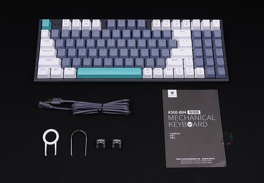제품 박스를 열어보면, 포장은 K600 시리즈와 동일한 방식이며, 제품구성에는 K500 기계식 키보드, 분리형 USB 전원케이블, 키풀러, 스위치 리무버, 여분의 교체용 스위치 2개, 제품설명서로 이루어져 있습니다. 앞서 리뷰로 만났던 K600 Gen2 모델 같은경우에도 핫-스왑방식이었지만, 여분의 교체용 스위치 제공은 없었는데, K500은 여분을 제공하는게 유선 키보드지만 좀 더 알차다 할 수 있죠.
