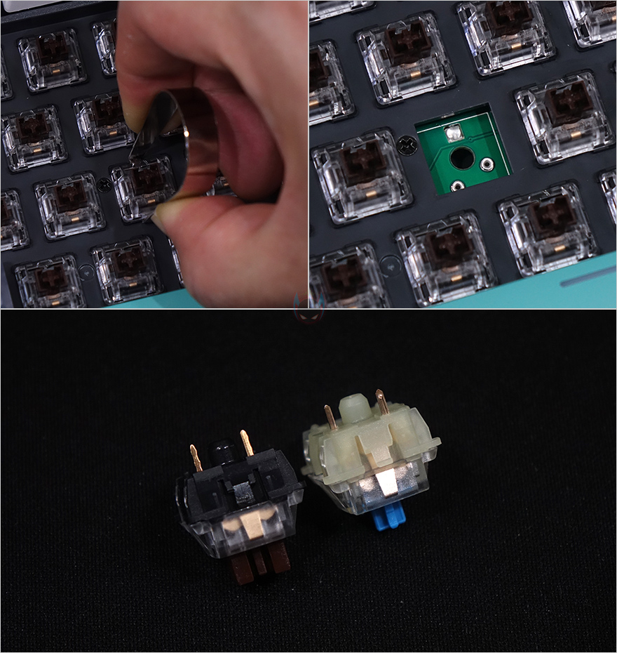키-캡은 PBT재질에 이중사출 방식이며, 스위치는 앞서 언급했듯이 총 3가지 타입이며, 스위치 회사는 후아노(Huano)입니다. 그리고, 제공되는 스위치 리무버를 사용해 스위치를 분리할 수 있는 핫-스왑(Hot-swap)방식을 적용하고 있는데, 스위치를 기판에서 빼내보면, 기판이 3pin 방식으로 장착되는 것을 확인할 수 있어서, 5pin 스위치는 호환이 되지 않으며, 후아노 스위치 같은경우에도 체리 같은 스위치와 비교해보면, 핀(pin) 폭이 좀 더 좁은 것을 확인할 수 있습니다. 그래서, 핫-스왑 방식으로 스위치 교체는 가능하지만, 교체할 스위치의 호환성을 확실히 알아볼 필요가 있겠습니다. 그리고, 스페이스-바 같은 키들의 스테빌라이저는 체리식입니다.