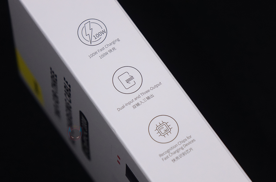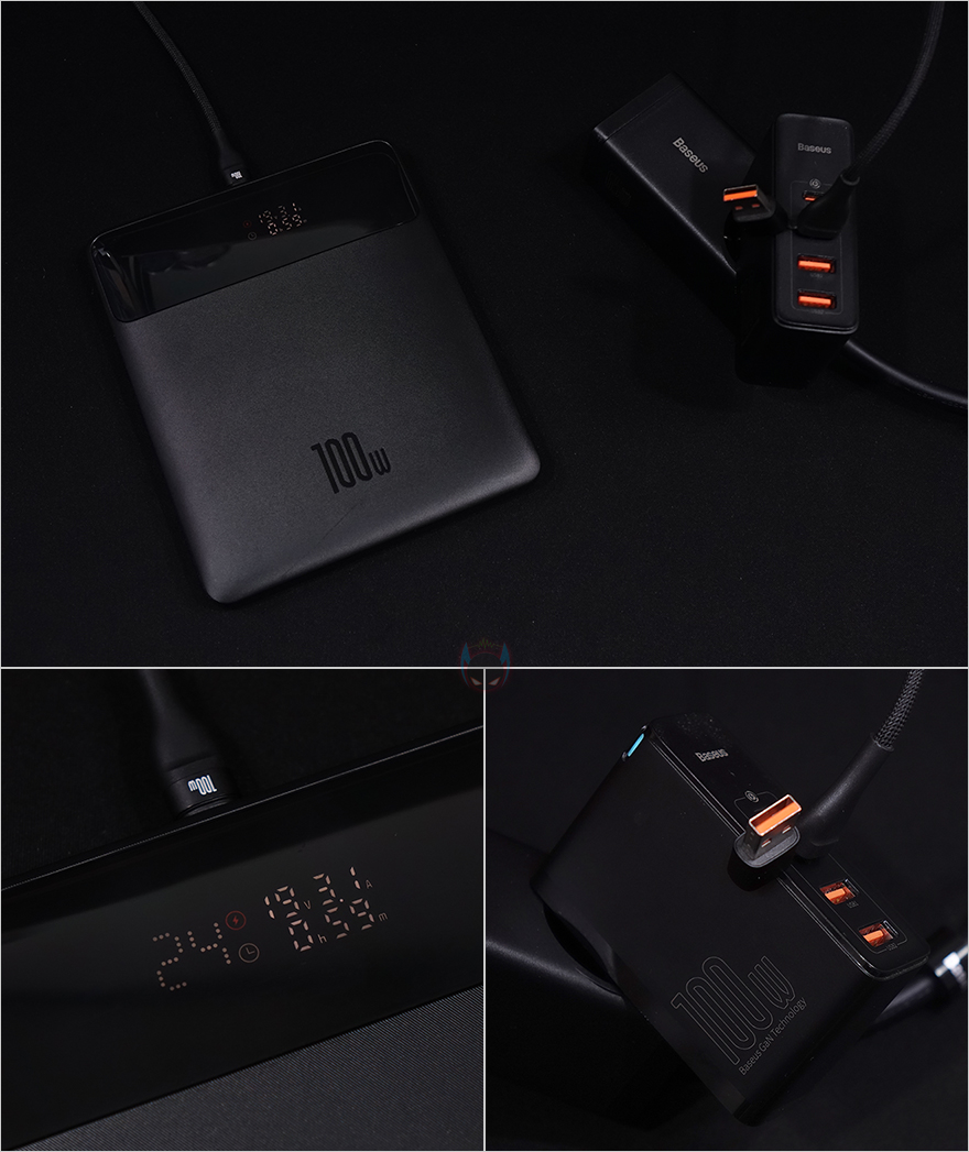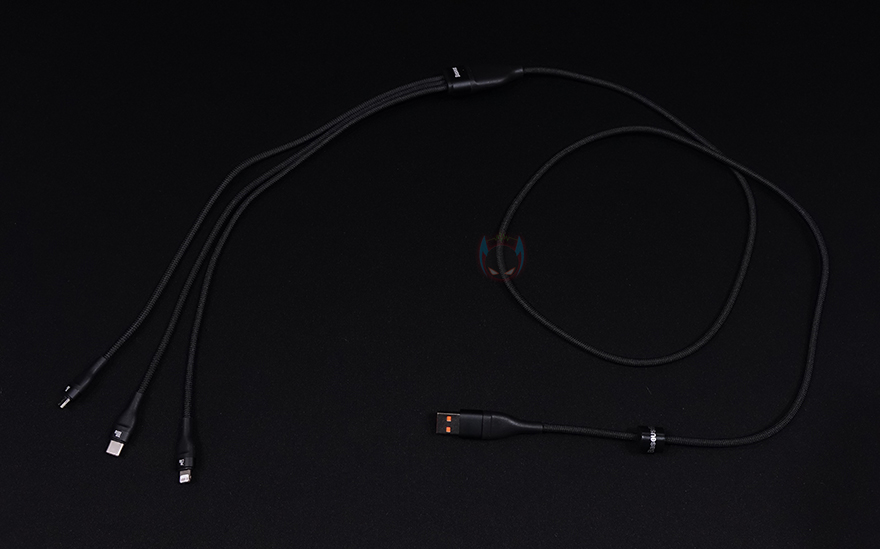 그리고, 3가지 인터페이스가 나뉘어지는 중간 분배지점에는 앞서 제품박스에서 확인했듯이, 고속충전을 지원하는 외부장치가 연결되었을 때, 고속충전 지원 제품임을 인식하는 칩이 내부에 적용되어 있으며, 로고(Logo) 바로 아래에는 작동상태를 확인할 수 있는 LED 인디케이터도 적용되어 있습니다. 또한, 충전어댑터와 연결되는 입력단자 USB 인터페이스도 USB Type-A와 Type-C 2가지를 젠더 방식으로 갖추고 있죠. 쉽게말해 100W 고속충전 어댑터를 사용할때는 USB Type-C로 어댑터와 연결하면 됩니다.