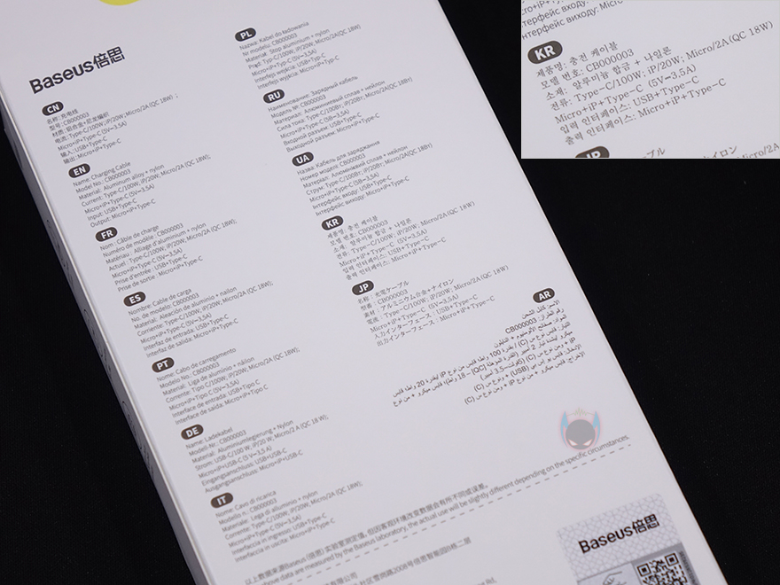 제품박스부터 살펴보면, 전면에 제품 이미지를 통해 바로 이 제품의 케이블 형태가 어떤 것이 알 수 있습니다. 시작에서 언급했듯이 3-in-1 방식으로 총 3개의 USB 인터페이스 충전 연결방식을 갖추고 있죠. 그리고, 박스 측면에는 제품의 주요 특징을 표기해놨는데, 최대 100W 고속충전, 2가지 입력방식과 3가지 출력방식, 고속충전 장치 인식 칩 탑재 입니다. 또한, 박스 후면에는 한국어를 포함해 각 나라별로 제품의 기본사양을 표기해놨죠. 박스를 열어보면, 포장은 흔들리지 않게 틀-방식에 끼운 별도의 포장재를 사용하고 있으며, 제품구성은 3-in-1 충전케이블, 보증서, 스티커 구성으로 간단합니다.
