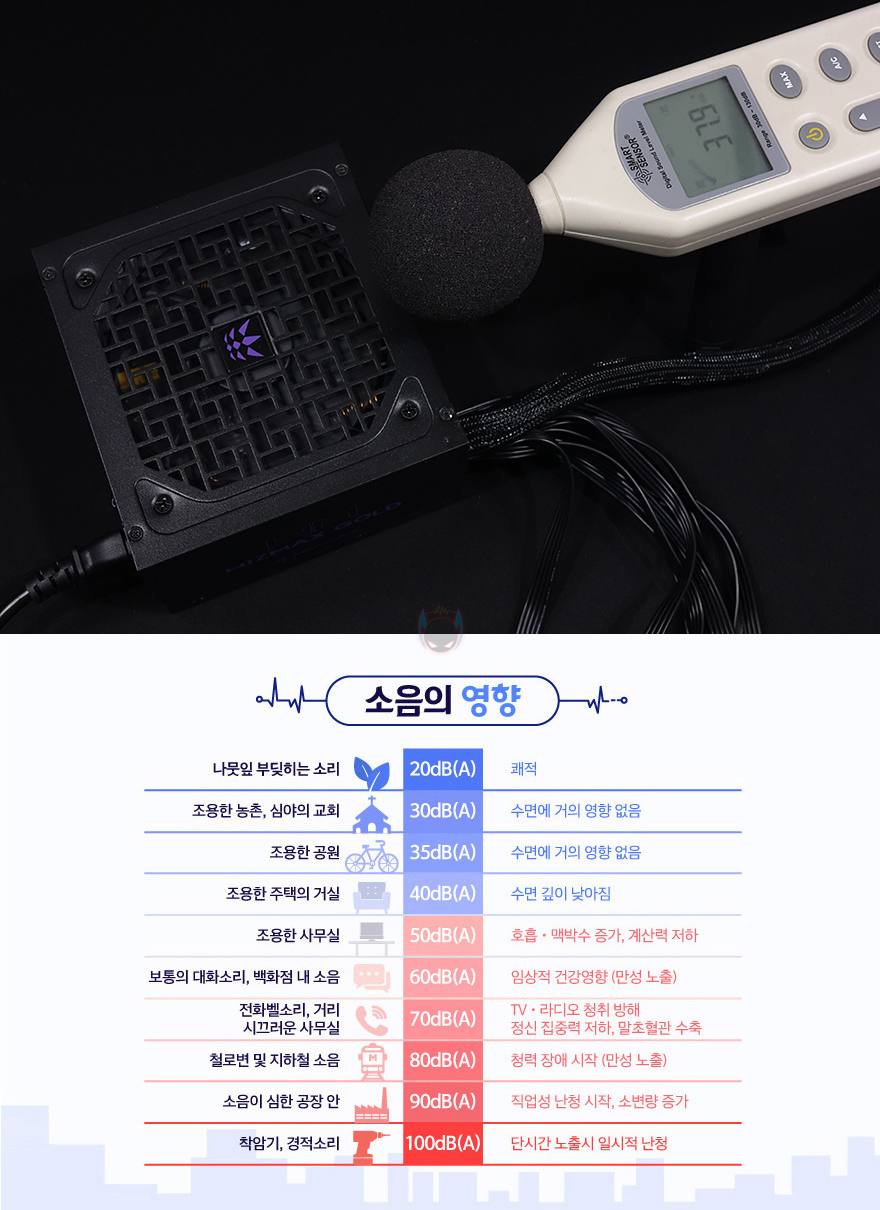 끝으로, 위즈맥스(WIZMAX) 파워서플라이의 기본작동상태에서 팬 소음을 측정해보면, 약 38dB(A)수준으로 이는 생활소음에서도 정숙한 편에 속합니다. 또한, 실제 PC케이스 내부에 장착해서 사용한다면 더 조용해지기때문에 사실상 소음에 대한 걱정은 할 필요가 없죠. 물론, 애프터쿨링이나 과부하 상태일때 팬 속도가 더 높아지기때문에 좀 더 소음이 높아질 수 있지만, 약 50dB(A)수준이라 역시 조용한 수준이 되겠습니다.