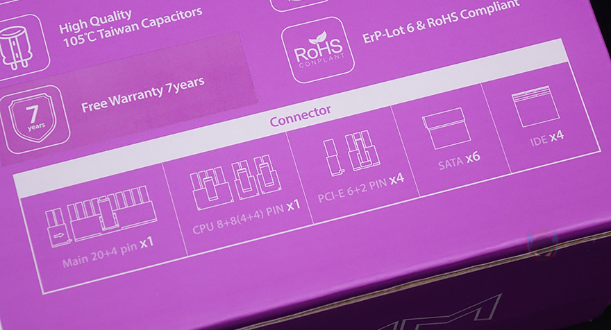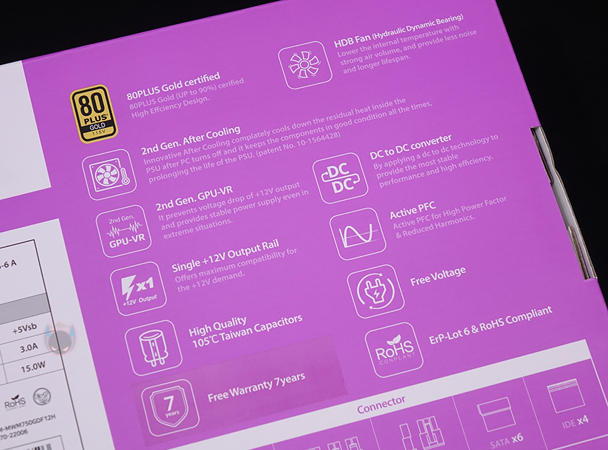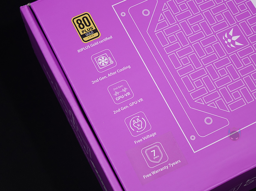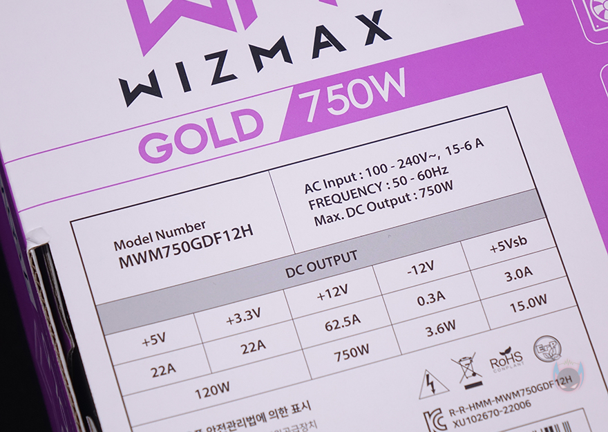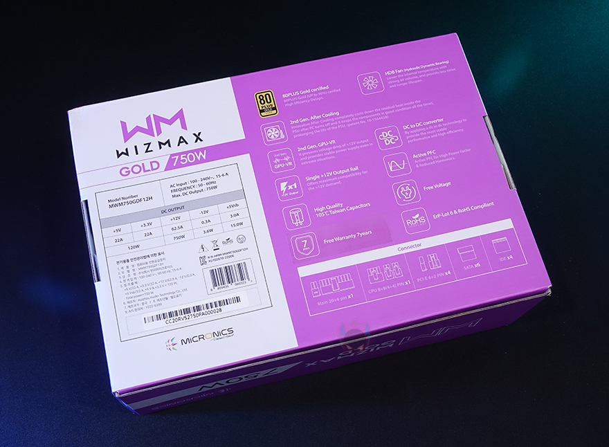 제품박스부터 살펴보면, 전면 오른쪽에는 WM이라는 위즈맥스(WIZMAX)로고와 함께 용량표기 그리고, 왼쪽에 80Plus Gold 등급, 2세대 애프터쿨링, 2세대 GPU-VR, 100~240V의 프리볼트, 7년 무상보증기간을 주요 특징으로 표기해놨습니다. 박스 후면 왼쪽에는 해당 용량모델의 기본사양 표기를 해놨으며, 오른쪽에는 전면에서 표기한 주요 특징외에도 DC-to-DC 컨버터, +12V 싱글레일, 액티브PFC, 메인콘덴서, 0.5W 미만의 대기전력 인증을 추가로 표기해놓고 있죠.