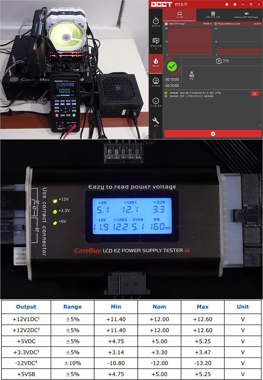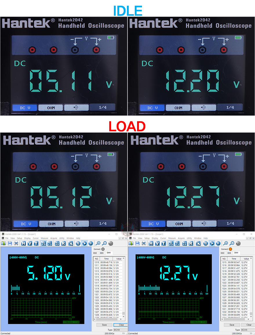 이제, 마이크로닉스 위즈맥스(WIZMAX) 파워서플라이를 직접 사용해봐야겠죠. OCCT 프로그램을 통해 5V와 12V의 전압출력상태를 확인해볼텐데, 그전에 전체 전압들의 기본 출력상태를 확인해보면, 인텔 파워서플라이 가이드 표준범위에서 정상적으로 출력되는 것을 확인할 수 있습니다. 그리고, OCCT 프로그램을 통해 100% 과부하의 LOAD 상태일때와 IDLE 대기상태일때 5V와 12V의 전압 출력 움직임을 확인해보면, IDLE에선 5V와 12V 모두 0.01V 수준으로 매우 안정적인 것을 확인할 수 있었으며, LOAD에선 5V경우 IDLE과 마찬가지로 0.01V 수준으로 매우 안정적이고, 12V 같은경우에는 변동없이 일명 칼전압 수준을 보여줘서 그래픽카드 전력공급에 매우 최적화 되어있다할 수 있겠습니다. 그리고, 전체 변동폭도 5V는0.02V 수준이고, 12V도 0.07V 수준이라 전체 출력상태도 매우 안정적이라 할 수 있죠.