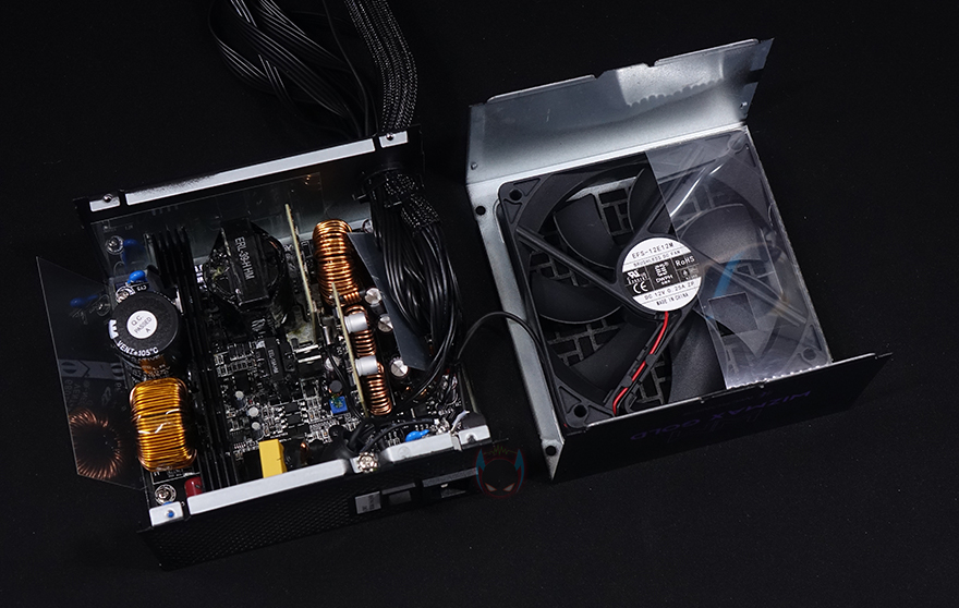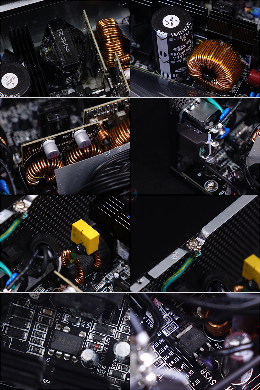 위즈맥스 파워서플라이 내부를 잠깐 살펴보면, 내부에 장착된 120mm 팬은 DWPH사의 제품으로 올해 출시했던 마이크로닉스의 VISION II 파워서플라이에 사용된 팬 회사와 동일합니다. 물론, 모델은 다른데 제조사 홈페이지를 참고해보면 해당 모델의 팬은 최대 2000RPM 속도를 가졌죠. 그리고, 공기흐름 유지를 위해 에어가이드도 기본 적용되어 있습니다. 또한, 내부에 눈으로 쉽게 확인되는 부분들을 살펴보면, 안정적인 전력공급을 위해 스위칭트랜스, 105℃ 고온에서 견딜 수 있는 대만산 420V/680㎌용량의 메인 캐패시터, 바로 옆에 액티브PFC, DC-to-DC 컨버터, 과전류방지 제한회로, 고주파음 최소화의 EMI필터, 내부전류흐름방지의 접지, PWM컨트롤 칩셋, 보호회로 칩셋 일부를 확인할 수 있습니다. 위즈맥스 라인업이 중급형정도에 속하기때문에 내부 구성은 충분히 탄탄하다 할 수 있겠습니다.