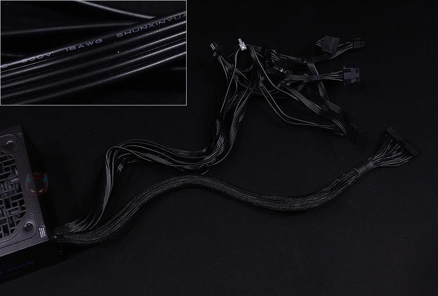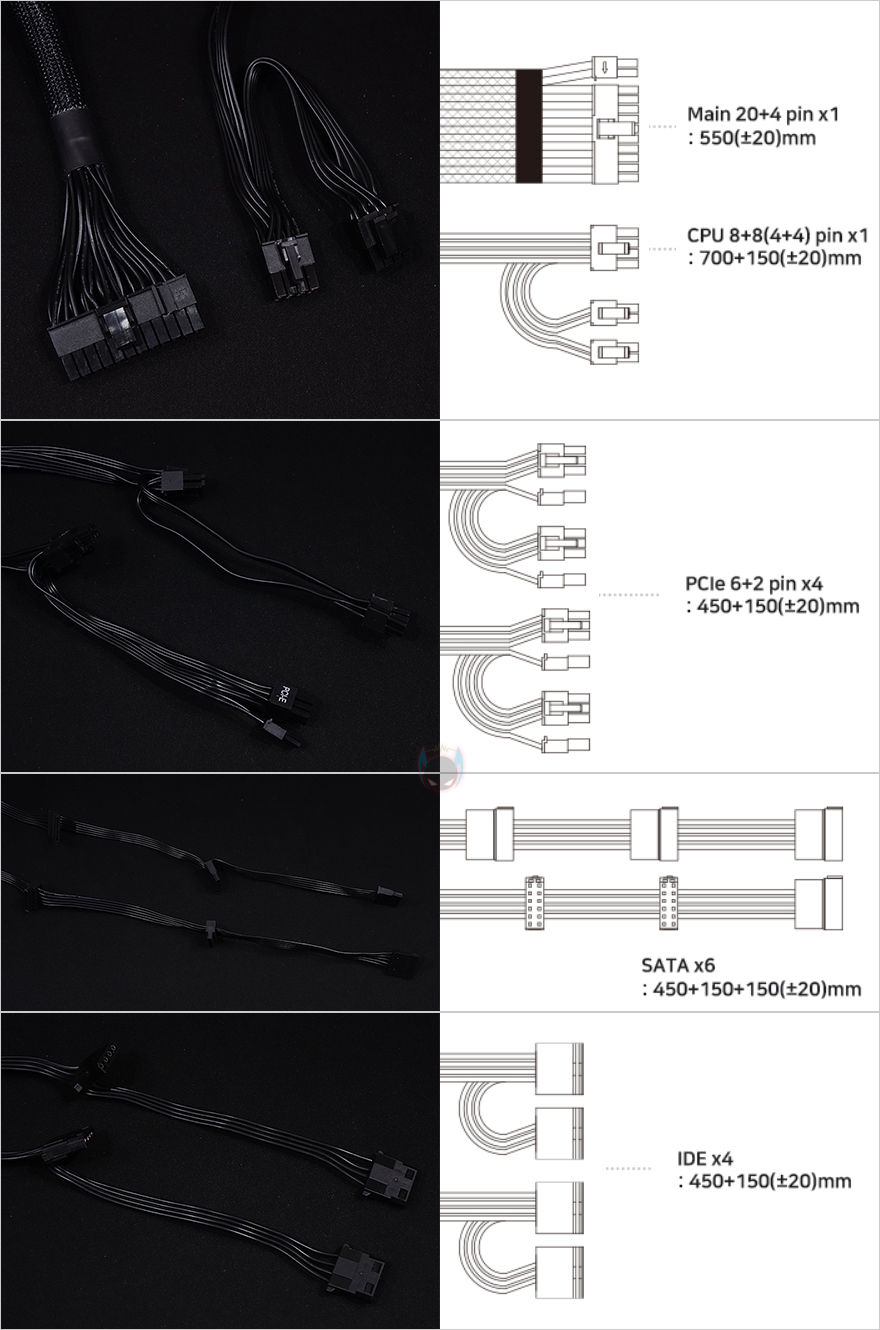 케이블은 메인보드 24핀 전원케이블을 제외한 나머지 케이블 모두 플랫(Flat)타입이며, 전선규격은 인텔 파워서플라이 가이드에 맞춘 18AWG를 사용했습니다. 커넥터구성은 750W 용량의 경우 메인보드 24핀, 보조전원 ATX 8핀 2개, PCI-E 8(6+2)핀 4개, S-ATA 6개, P-ATA 4개를 갖추고 있는데, 최신 메인보드나 고급형 그래픽카드를 받쳐주기에 충분한 구성이라 할 수 있습니다. 또한, 케이블길이도 요즘 PC케이스에 맞춘거라 충분히 넉넉한 길이를 가졌죠.