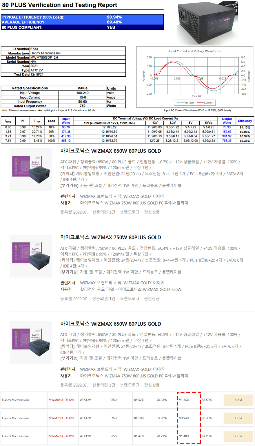 그리고, 이번 위즈맥스 파워서플라이경우 앞서 제품박스에서 확인했듯이 80Plus Gold 등급 인증의 전력효율로 출시되었습니다. 750W용량의 모델의 경우 80Plus 홈페이지에 등록된 자료를 확인해보면, 50% Load 효율이 90.94%인 것을 확인할 수 있는데, Gold 바로위에 플래티넘 등급과 불과 1%정도밖에 차이나지 않죠. 또한, 이번 위즈맥스는 650W와 850W까지 총 3개의 모델로 출시되었는데, 나머지 2개의 모델들도 91%대의 전력효율을 가지고 있는 것을 확인할 수 있습니다.