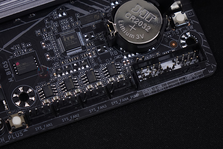 그리고, DDR5를 지원하는 메모리 슬롯은 총 4개 구성으로 풀-뱅크 구현이 가능하고, 클럭은 4,000~6,000MHz 이상으로 지원해 주고 있으며, 용량은 최대 128GB까지 갖출 수 있죠. 또한, 슬롯 주변에는 CPU FAN 커넥터와 수랭 쿨러 사용 시 워터-블록의 펌프 겸용으로 사용할 수 있는 팬 커넥터, 그리고, 5V ARGB와 12V RGB 헤더가 배치되어 있으며, PC 케이스의 USB 포트와 연결되는 USB 3.2 내부 헤더, USB Type-C 내부 헤더, 그리고, 썬더볼트 헤더 배치를 확인할 수 있습니다. 그리고, 그 아래에는 S-ATA 커넥터 6개도 배치되어 있으며, 메인보드 오른쪽 맨 아래에 패널 커넥터, 그 왼쪽으로 PWM 팬 커넥터 4개도 나란히 배치된 것을 확인할 수 있으며, 좀 더 왼쪽으로 이동하면 USB 1.1&2.0 내부 헤더 2개, 윈도우 11부터 필요해진 TPM, 12V RGB, 5V ARGB 내부 헤더도 추가로 배치된 것을 확인할 수 있습니다.