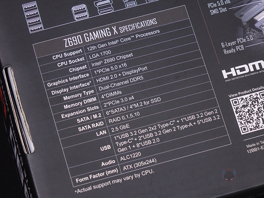 제품 박스부터 살펴보면, 전면에는 메인보드의 방열판 일부 이미지와 함께 모델명을 확인할 수 있고, 국내 정식 유통사 중 한 곳의 3년 무상보증기간, 그리고, 인텔 12세대부터 지원되는 PCIe 5.0과 DDR5 지원도 확인할 수 있습니다. 박스 한쪽 측면에는 한국어도 간단하게 제품 문구를 표기해놨습니다. 또한, 박스 후면에는 메인보드 풀-샷 이미지와 함께 기본 사양 표기를 확인할 수 있고, 오른쪽에 제품의 주요 특징 표기도 확인할 수 있는데, 전원부, 방열판, PCIe 5.0, DDR5 메모리, PCIe 4.0 M.2 SSD 지원을 언급합니다. 뒤에서도 다시 확인하겠지만, 개인적으로 이 제품을 선택한 가장 큰 이유는 전원부입니다.