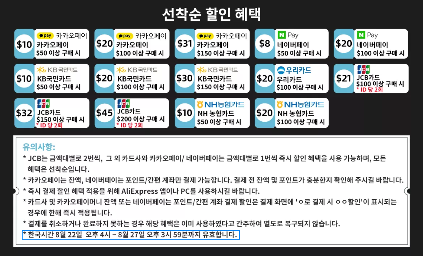 한국시간으로 오늘 8월 22일 오후 4시부터 알리익스프레스에서 8월 할인행사인 '메가 브랜드 세일'을 시작한다(8월 27일 마감). 이번 메가 브랜드 세일은 알리익스프레스에서 소비자들에게 인기있는 브랜드를 최대 90%까지 할인하는 행사로 구입상품이 $30씩 넘을때마다 최대 $9달러 할인은 해주고, 결제시 카카오페이, 네이버페이, KB국민카드, NH농협카드, 우리카드, JCB카드 사용시 추가 할인도 해주고 있다. 물론, 결제 할인혜택은 선착순.