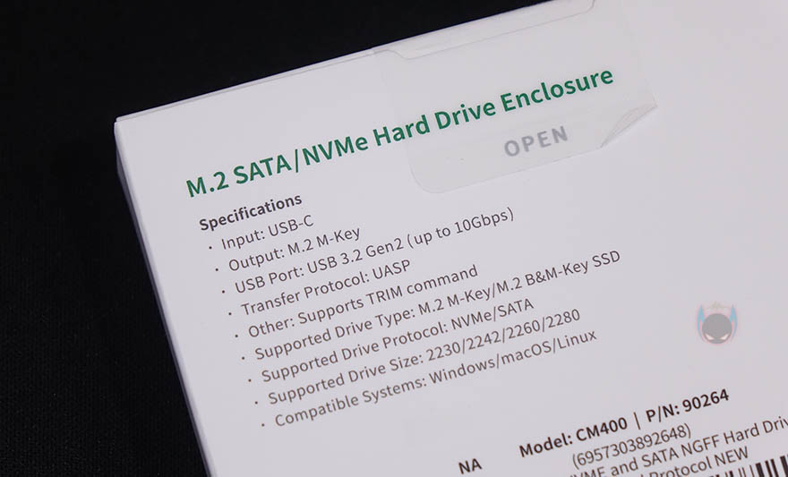 제품박스부터 살펴보면, 전면에 제품 이미지를 담고 있어서 케이스 디자인을 미리 확인할 수 있으며, 한눈에 봐도 외장 SSD 케이스라는 걸 알 수 있죠. 그리고, 아래에는 SATA와 NVMe 둘 다 지원한다는 문구와 10Gbps 전송속도, 슬림/컴팩트한 사이즈를 언급하고 있으며, 박스 후면에는 제품의 스펙정보를 확인할 수 있습니다. 포장은 구성품별로 모두 비닐 포장이 되어 있으며, 구성품은 케이스, USB케이블 2개, 여분의 고정클립, 제품설명서로 이루어져 있습니다.