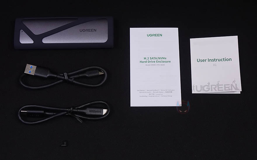 SSD가 장착되는 가이드를 살펴보면, SSD 장착 길이는 2280까지 지원하며, 오른쪽 맨 끝부분 고정홈에는 기본 고정클립이 끼워져 있죠. 물론, 분실이 되더라도 앞서 구성품에서 본 1개의 여분이 더 있기때문에 걱정하지 않아도 됩니다. SSD는 장착은 먼저 고정 클립을 빼로, SSD는 45˚ 각도에서 끼운 후 다시 고정클립을 끼워서 고정하면 장착이 끝나죠. 케이스분리부터 SSD 장착까지 무나사 방식으로 매우 간단하고 편리합니다. 그리고, 가이드 왼쪽 그러니깐 포트 위치에는 내부 칩셋 발열을 위해 앞뒤면으로 모두 에어홀 처리가 되어 있으며, 칩셋 PCB기판 후면에도 써멀패드가 부착되어 확실히 발열해결을 잡아줍니다. 제공되는 2개의 USB 데이터케이블은 각각 Type-C to A 케이블과 Type-C to C 케이블 입니다.