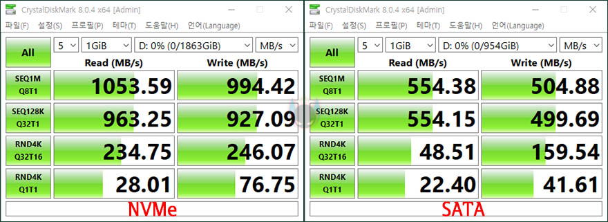 직접 유그린(UGREEN) M.2 SSD 케이스르 사용해봐야겠죠. 앞서 언급했듯이 USB 포트는 USB 3.2 Gen2 규격까지 지원합니다. 이 규격은 요즘 노트북이나 데스크탑PC에선 대부분 지원하는 규격이죠. 그리고, 케이스에 장착되는 SSD 인터페이스 규격 역시 제품박스에서 확인했듯이 NVMe와 SATA 둘 다 지원합니다. 그래서, NVMe SSD와 SATA SSD 모두 벌갈아 가면서 장착해 전송속도를 확인해봤는데, NVMe SSD는 이 제품에서 지원하는 최대 10Gbps 속도를 보여줬고, SATA SSD는 원래 SATA SSD가 발휘하는 최대 속도 500MB/s대를 그대로 보여줍니다. 그래서, 케이스의 성능은 둘 다 만족스럽다 할 수 있죠.