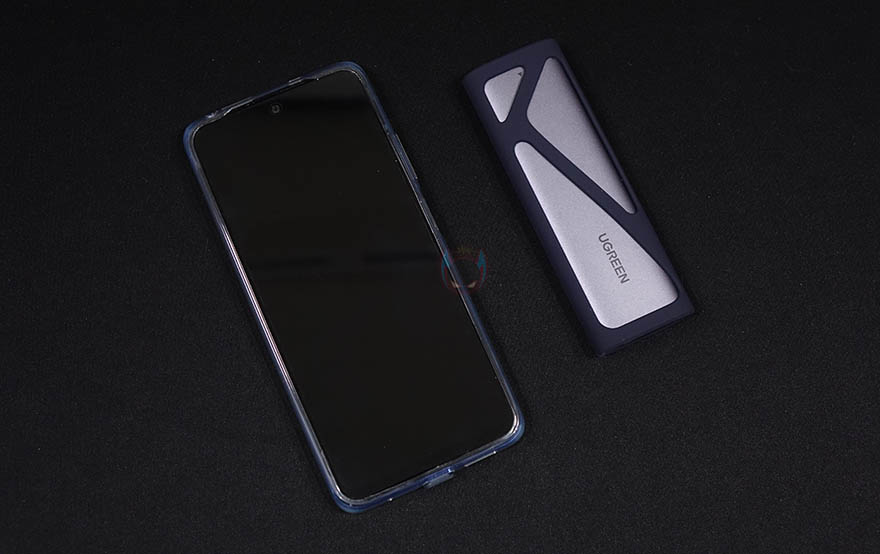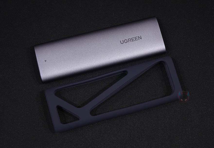 본격적으로 유그린(UGREEN) M.2 SSD 케이스를 살펴보면, 크기는 딱 외장 SSD 크기수준으로 스마트폰보다 작아서 한손에 쥐고 다니기에 편합니다. 그리고, 케이스 외부에는 충격방지를 위해 실리콘 재질의 쉴드가 끼워져있는데, 쉽게 분리할 수 있습니다. 실리콘 쉴드를 분리한 상태에서 케이스만 살펴보면, SSD가 내부에 장착되기때문에 자체 발열해결을 위해 케이스 재질은 알루미늄으로 사용되었습니다.