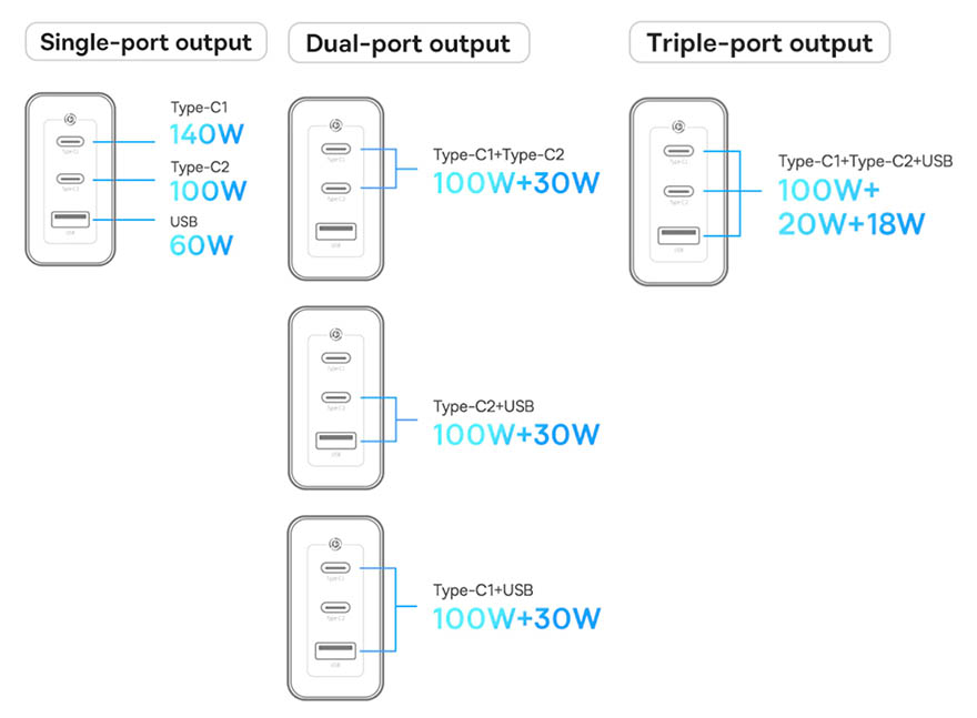 충전기의 포트 구성은 100W GaN2 Pro와 비교해보면, 1개가 줄어든 3개의 포트를 갖추고 있는데, Type-C 포트 2개, Type-A 포트 1개 구성으로 A포트가 하나 줄었습니다. 그리고, 앞서 제품박스에서 확인한 충전속도 지원은 포트 반대편에 다시 표기해놨기때문에, 충전하기전에 참고하면 되고, 최대 140W 충전속도를 지원하는 포트는 1번 포트인 'Type-C1'이며, 2번인 'Type-C2'는 최대 100W, Type-A는 최대 60W를 지원합니다. 3개의 포트 모두 최신 노트북이나 스마트폰 등의 고속충전을 갖추고 있어서, 어느 포트를 사용해도 사실상 고속충전이죠. 물론, 1개의 포트를 사용했을때가 최대 속도이며, 2개이상의 포트를 사용하면 충전속도가 낮아지는데, 그래도 1번인 'Type-C1' 포트는 2개 또는 3개 포트 모두 사용해도 100W 고속충전을 유지하기때문에 노트북이나 최근 플래그쉽 스마트폰 고속충전을 커버할 수 있는 충전기를 원했던 소비자에겐 매력이라 할 수 있습니다. 이밖에도 충전기에는 모서리부분에 사용시 작동상태를 확인할 수 있는 LED 인디케이터가 적용되어 있으며, 한국은 220V 전기규격이기때문에 구입시 EU Plug를 선택하면 되겠습니다. 또한, 기본제공되는 USB 충전케이블 역시 현존하는 충전케이블 중 최대 속도인 240W까지 지원합니다.