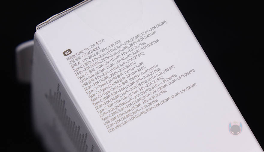 제품박스부터 살펴보면, 전면에는 제품 이미지가 실려있는데, 작년에 출시했던 100W GaN2 Pro와 제품디자인은 비슷하다라는걸 미리 짐작할 수 있고, 맨 오른쪽 모서리 위아래에 각각 140W와 GaN(질화갈륨) 방식을 표기해놨습니다. 왼쪽 아래에는 GaN5 Pro 모델명을 표기해놨고, 아래에 포트 구성표시도 확인할 수 있죠. 박스 측면에는 모바일기기를 제외한 노트북 같은 전자기기의 고속충전 지원인 PD인증을 확인할 수 있는데, 이번에 세계 최초로 PD 3.1인증을 받았습니다. 그리고, 반대쪽 측면에는 한국어로 자세하게 기본사양을 표기해놨죠.