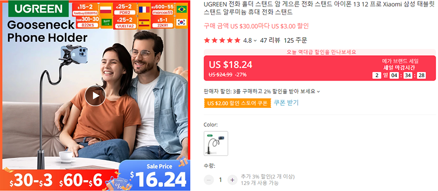 스마트폰 보는 시간이 많거나 또는 업무를 스마트폰으로 이용하는 소비자라면 하나쯤 있어서 편할 아이템이 바로 유연성을 가진 거치대 제품이라 할 수 있는데, UGREEN(유그린)의 플렉서블 폰 거치대는 알루미늄 합금을 사용해 튼튼함과 유연성을 동시에 가지고 있는 거치대로 책상이나 침대 어디서든 자유롭게 스마트폰을 편하게 놓고 사용하고 싶었던 소비자에겐 매력적인 제품이라 생각됩니다. 집게 방식이라 사용법도 간단하고 편리하죠. 현재 유그린 알리익스프레스 공식 스토어에서 할인행사를 하고 있으니, 플렉서블 폰 거치대 필요했던 분들은 참고해보세요. 그럼, 이상으로 마치겠습니다.