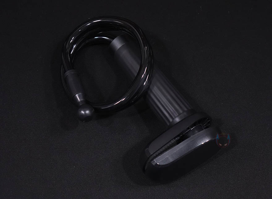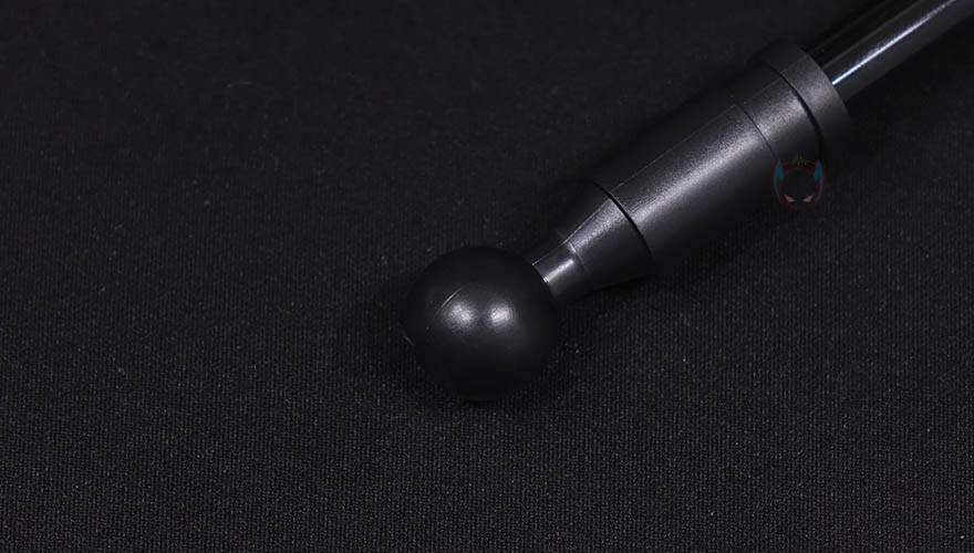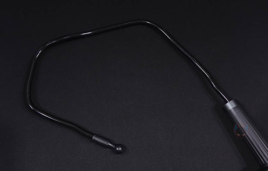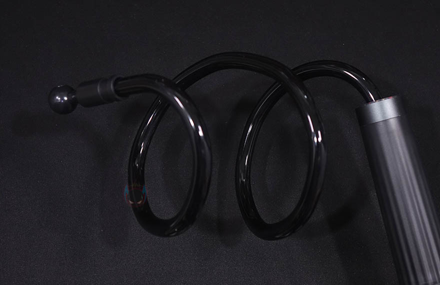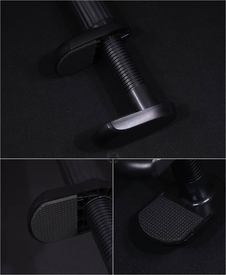 이번엔 책상에 고정해주고 동시에 집게와 연결되는 클램프 암을 살펴보는데, 일단 암(Arm) 부분의 마감은 유광 고무질감이지만, 내부에는 알루미늄 합금이 사용되어서 견고하면서도 자유롭게 구부릴 수 있는 플렉서블 형태입니다. 시작에서 잠깐 언급했듯이 국내에선 일명 '자바라'라고 부르는데 원래는 플렉서블 또는 해외에서 흔히 말하는 구즈넥(Goosenek)이 좀 더 정확한 표현이죠. 그리고, 암 끝부분에는 집게와 결합되는 볼-헤드 수핀이 적용되어 있으며, 결합하는 방법은 간단하게 집게의 볼-헤드 암핀을 풀고 수핀 헤드를 끼운 후 다시 조이면 됩니다. 그럼 빠지지는 않고 자유롭게 각도조절을 할 수 있죠. 또한, 암 길이는 약 80cm로 경쟁사 제품들과 비슷한 길이이며, 자유롭게 구부릴 수 있어서 어떤 각도에서든 스마트폰을 위치 시킬 수 있습니다. 그리고, 데스크에 고정해주는 클램프 역시 안쪽에 위아래로 밀착 패드가 부착되어 있으며, 최대 8cm 두께까지 고정할 수 있습니다.