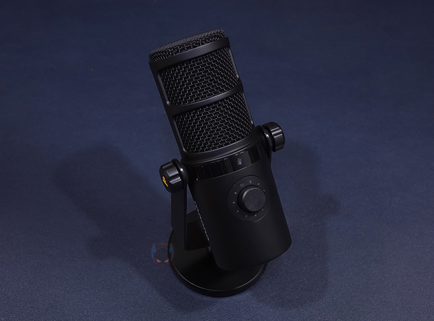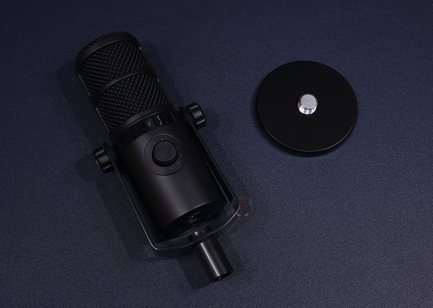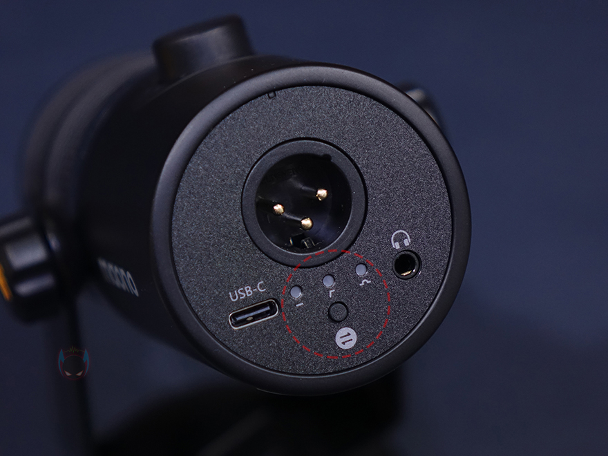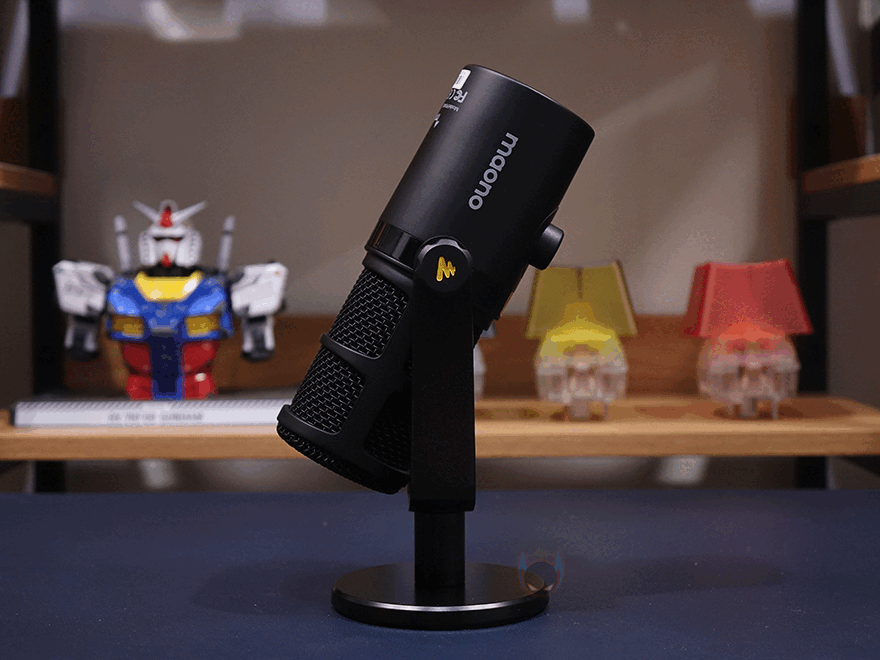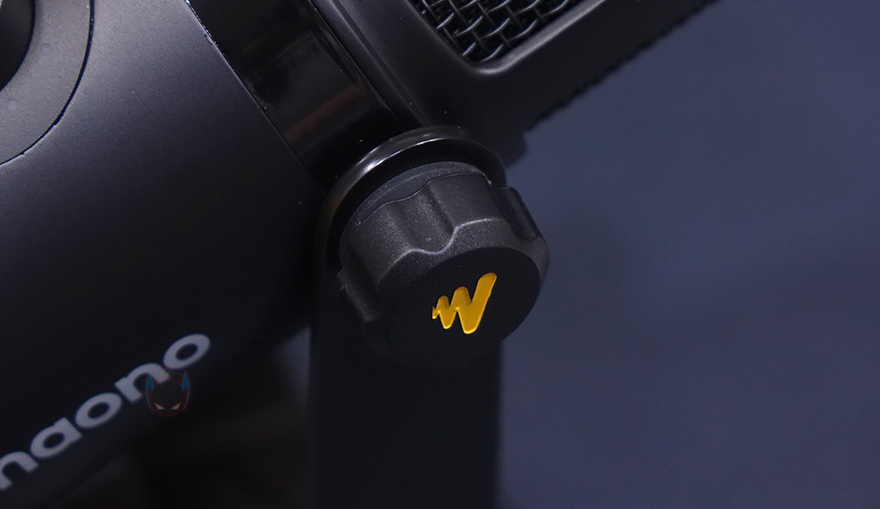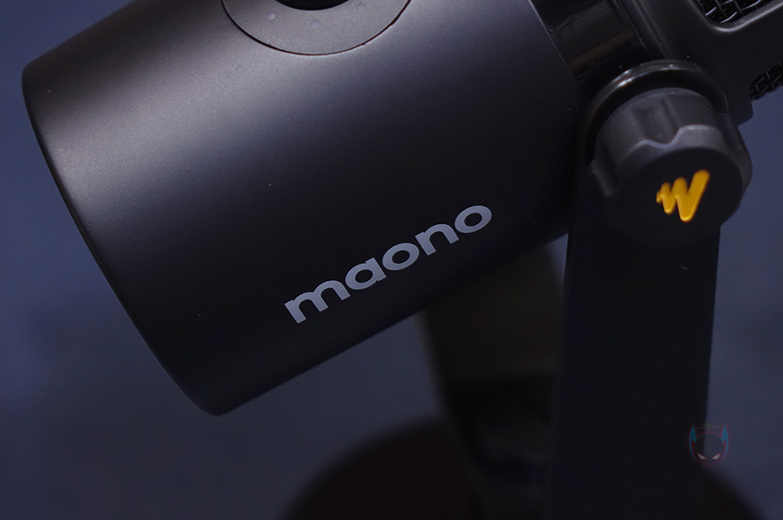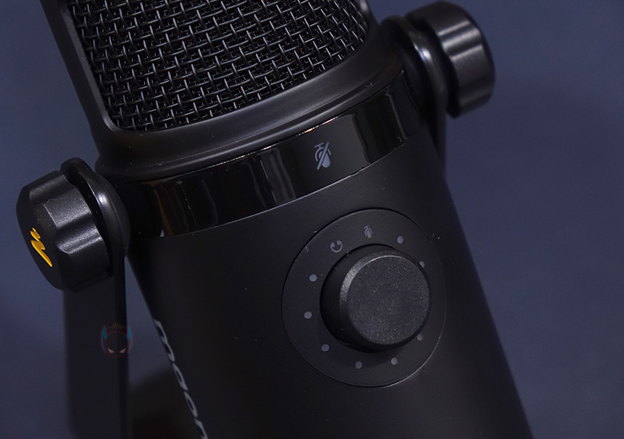 그리고, 마이크 정중앙에는 유일하게 표면이 광택처리된 부분으로 마이크 On/Off(Mute) 표시가 있는데, 터치(Touch) 방식으로 사용 중에 즉각적으로 이용할 수 있으며, 뒤에서 확인하겠지만, On/Off 상태는 LED 점등으로 구분해줍니다. 그리고, 아래에는 노브(Knob)가 배치되어 있는데, 노브는 마이크 게인(Gain), 헤드셋 볼륨(headphone volume), 모니터링 믹스(monitor mix)를 조절할 수 있는 3-in-1 형태로 노브 테두리에 게이지와 마이크, 헤드폰 구분을 확인할 수 있게 역시 LED가 적용되어 있습니다. 이외에도 마이크 측면에는 MAONO 로고(Logo)가 새겨져 있으며, 마이크 각도 조절을 할 수 있는 손나사가 적용되어 있는데, 마이크 각도 조절은 앞뒤 구분 없이 돌리면서 자유롭게 조절할 수 있습니다.