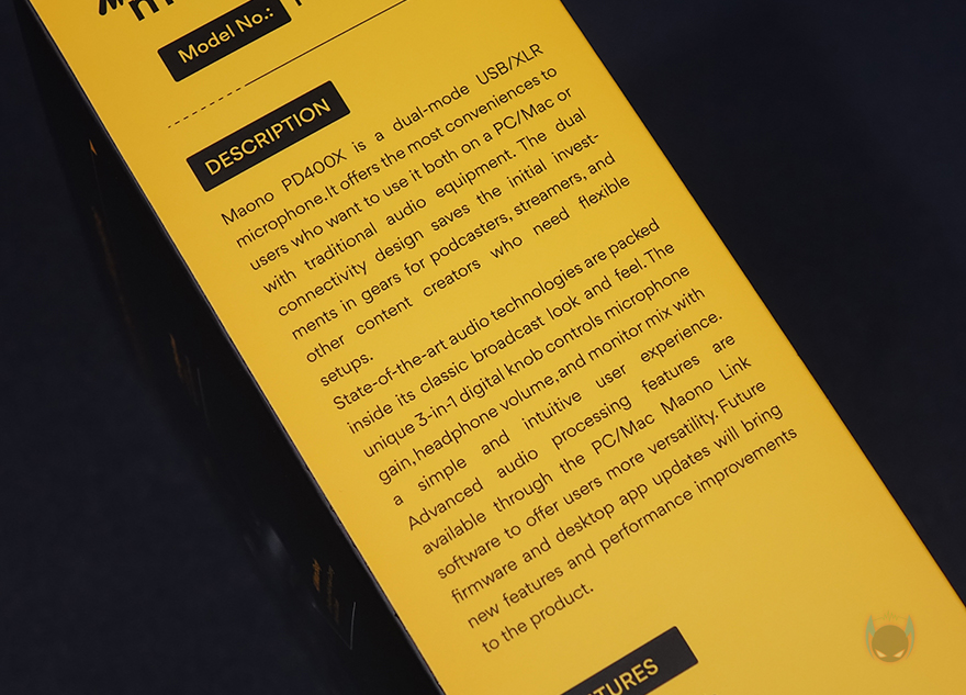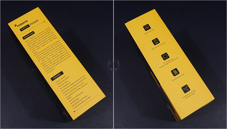 그리고, 박스 한쪽 측면에는 PD400X 소개 문구와 제품의 주요 특징(Features)을 표기해놨으며, 반대쪽 측면에는 아이콘 형식으로 5가지 특징을 표기해놨는데, 패턴, USB/XLR, 3-in-1 노브(Knob), 지연없는 모니터링, 호환성을 언급해놨습니다. 박스 후면에는 제품 풀샷 이미지와 함께 부위별로 주요 특징을 표기해놨죠. 구입 전에 제품 박스에 충분히 정보를 담고 있기 때문에 구입에 도움이 되겠습니다.