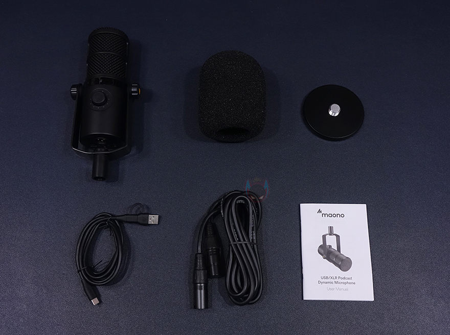 제품 포장은 겉박스를 벗기면 속 박스가 한 번 더 적용된 형태로 속 박스를 열어보면, 제품 구성품들이 이탈 및 외부 충격방지가 되도록 우레탄-폼에 수납된 형태로 포장되어 있습니다. 제품 구성은 PD400X 마이크(Microphone), 윈드 스크린(Wind Foam), 탁상용 받침대(Desktop Stand Base), USB 케이블, XLR 케이블(Cable), 제품설명서(Manual)로 이루어져 있습니다.